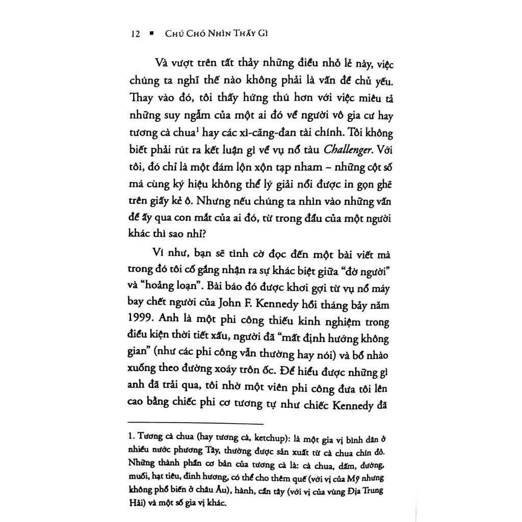 Mua tại TiktokGIỚI THIỆU SÁCH : Chú Chó Nhìn Thấy Gì? (Tái Bản ) Có cấu trúc và giọng văn cân nhắc chỉn chu, song bạn sẽ thấy 19 bài viết trong cuốn sách này đề cập đến những khía cạnh hoàn toàn khác nhau của cuộc sống từ việc: "Mù tạt giờ đây xuất hiện với cả tá chủng loại. Vì đây ketchup vẫn nguyên xi y dạng?" "Những điều về sức khỏe phụ nữ mà cha đẻ của thuốc ngừa thai không hề biết" "Cuộc sống của một người có đáng bị hủy hoại chỉ vì lời buộc tội đạo văn?"... Mỗi bài viết điều có khả năng thu hút bạn, khiến bạn phải ngẫm nghĩ, hay đem lại cho bạn ý niệm lờ mờ nào đó về trí não của kẻ khác". Hãy đọc và cùng khám phá những cuộc phiêu lưu của Gladwell để hiểu rõ hơn những hiện tượng xung quanh bạn, qua đó bồi đắp thêm kinh nghiệm sống cho bản thân. Cuốn sách chia làm ba phần: Phần thứ nhất: Những kẻ ám ảnh, những người tiên phong và những kiểu thiên tài nhỏ lẻ khác Phần thứ hai: Những luận thuyết, tiên lường và chuẩn đoán Phần thứ ba: Nhân phẩm, tính cách và trí tuệ