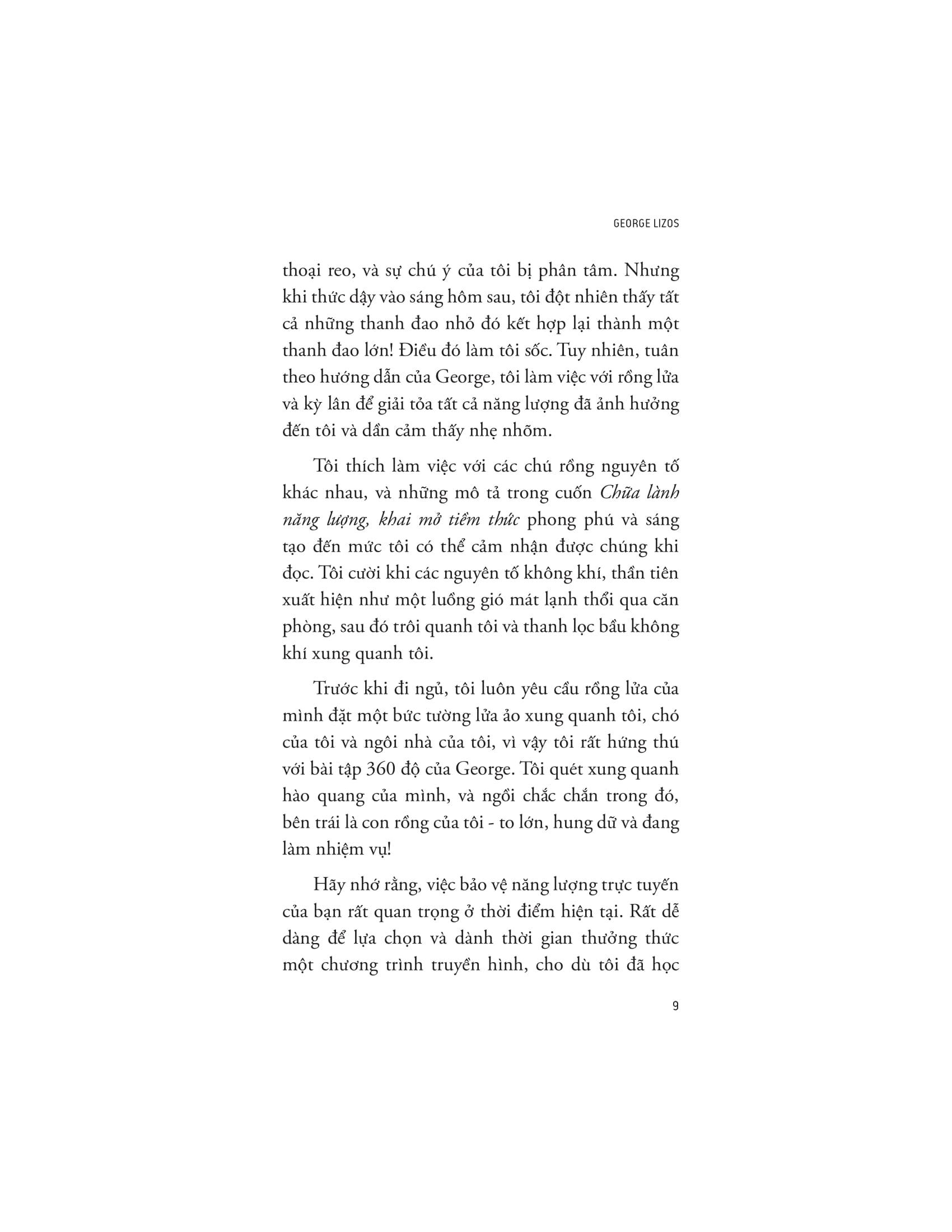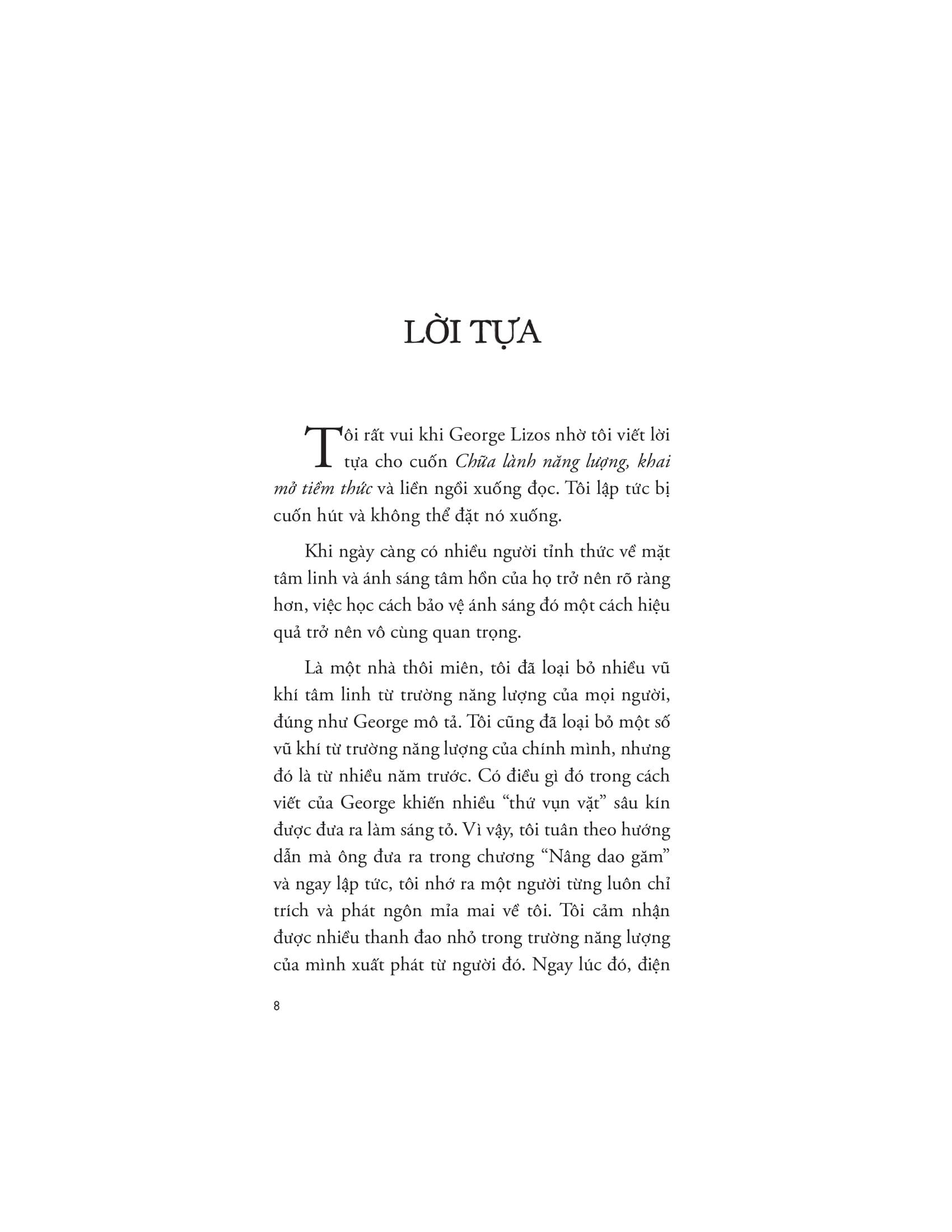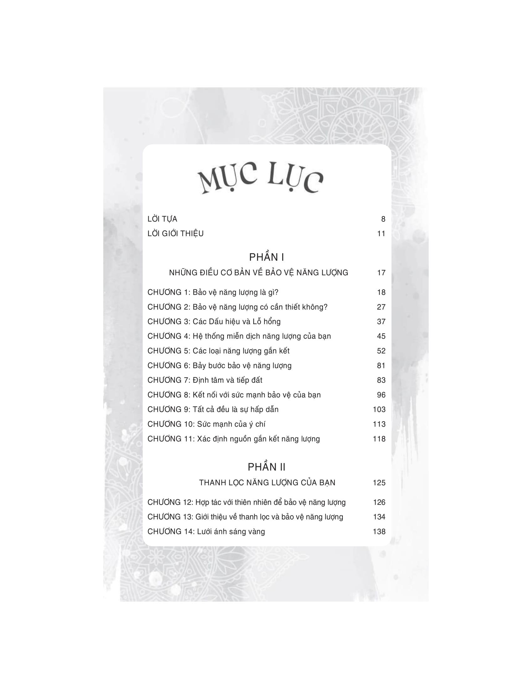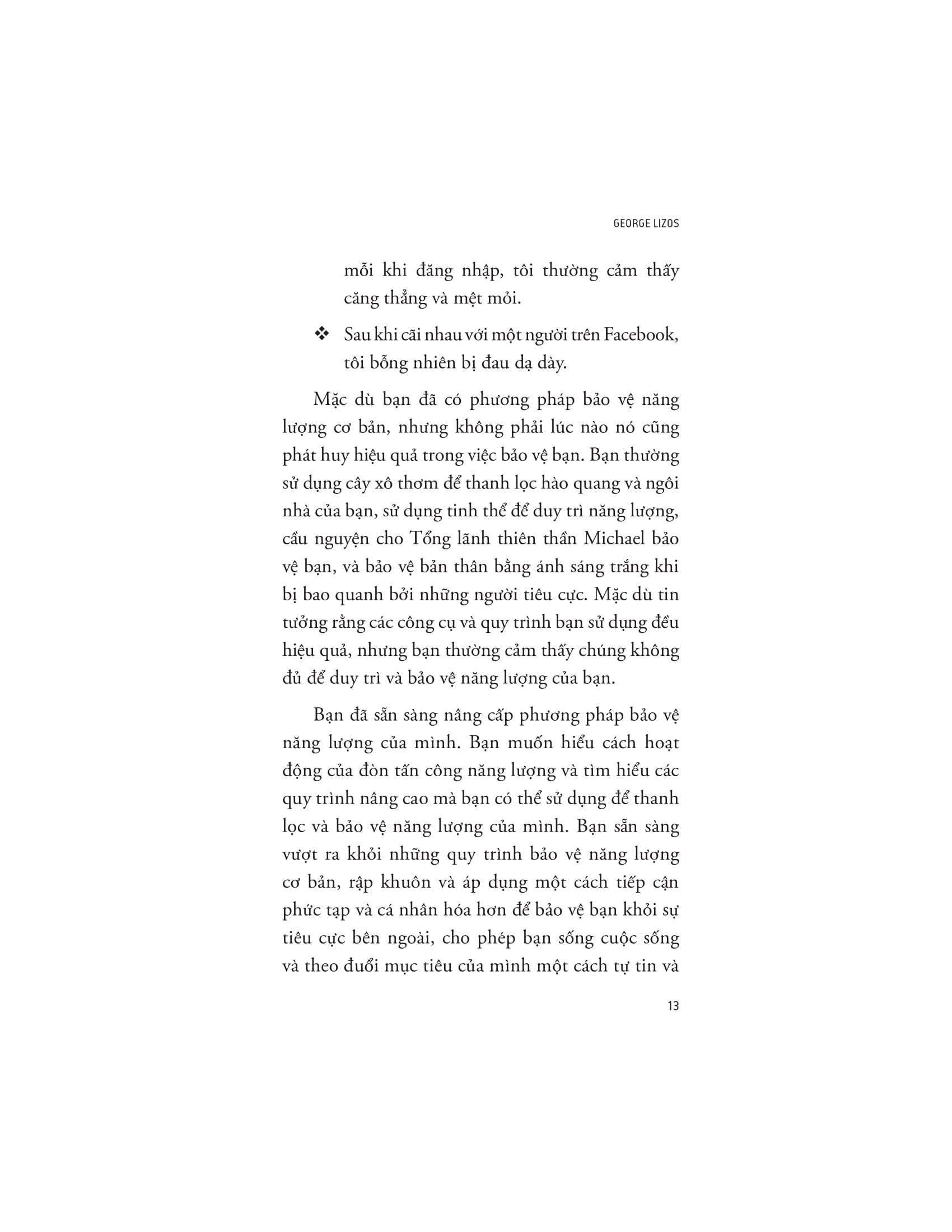 Tác giả George Lizos định nghĩa bảo vệ năng lượng là nghệ thuật duy trì suy nghĩ, cảm xúc và hành vi không bị tác động bởi môi trường xung quanh. Sách giới thiệu cách thiết lập ranh giới năng lượng rõ ràng, quản lý tương tác để giữ vững tính xác thực cá nhân. Qua đó bạn sẽ học được cách: