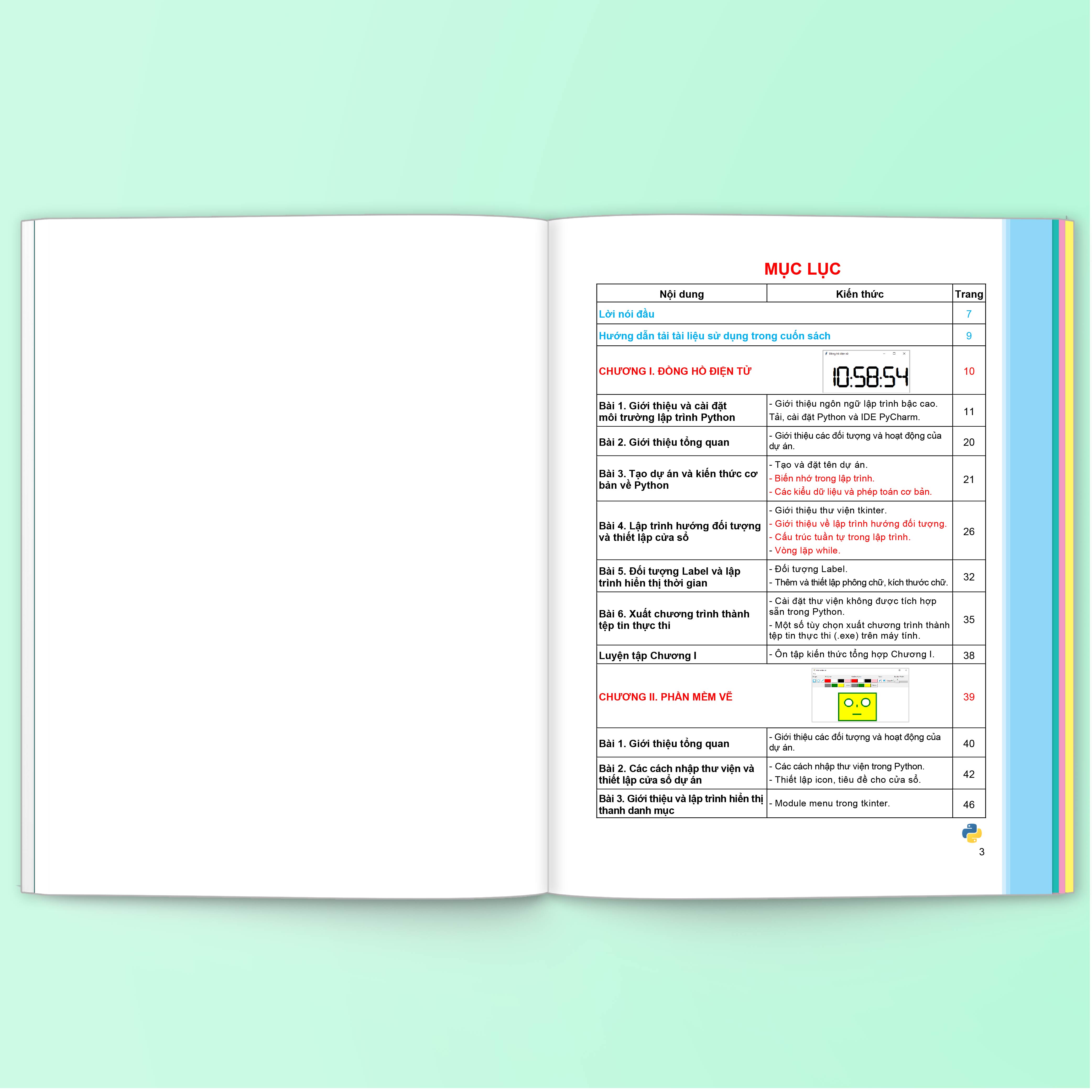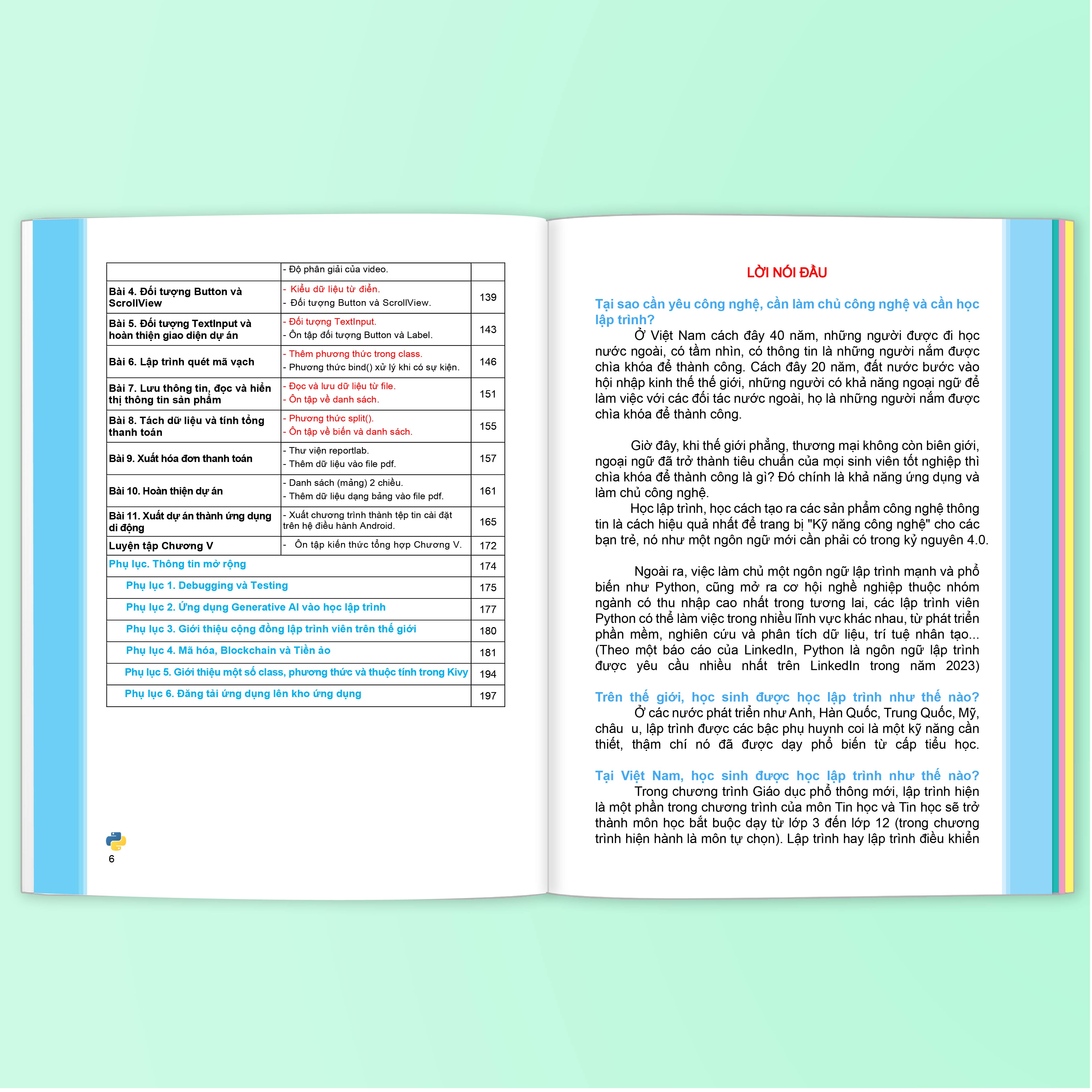 Ngoài ra, phần phụ lục sẽ hướng dẫn các bạn cách tìm và sửa lỗi sai trong chương trình; Cách sử dụng trí tuệ nhân tạo chatbot trong học lập trình; Giới thiệu cộng đồng lập trình viên trên thế giới; Giới thiệu về mã hóa, công nghệ blockchain và tiền ảo; Giới thiệu thêm một số đối tượng trong thư viện Kivy; Hướng dẫn cách đăng tải ứng dụng lên chợ ứng dụng.