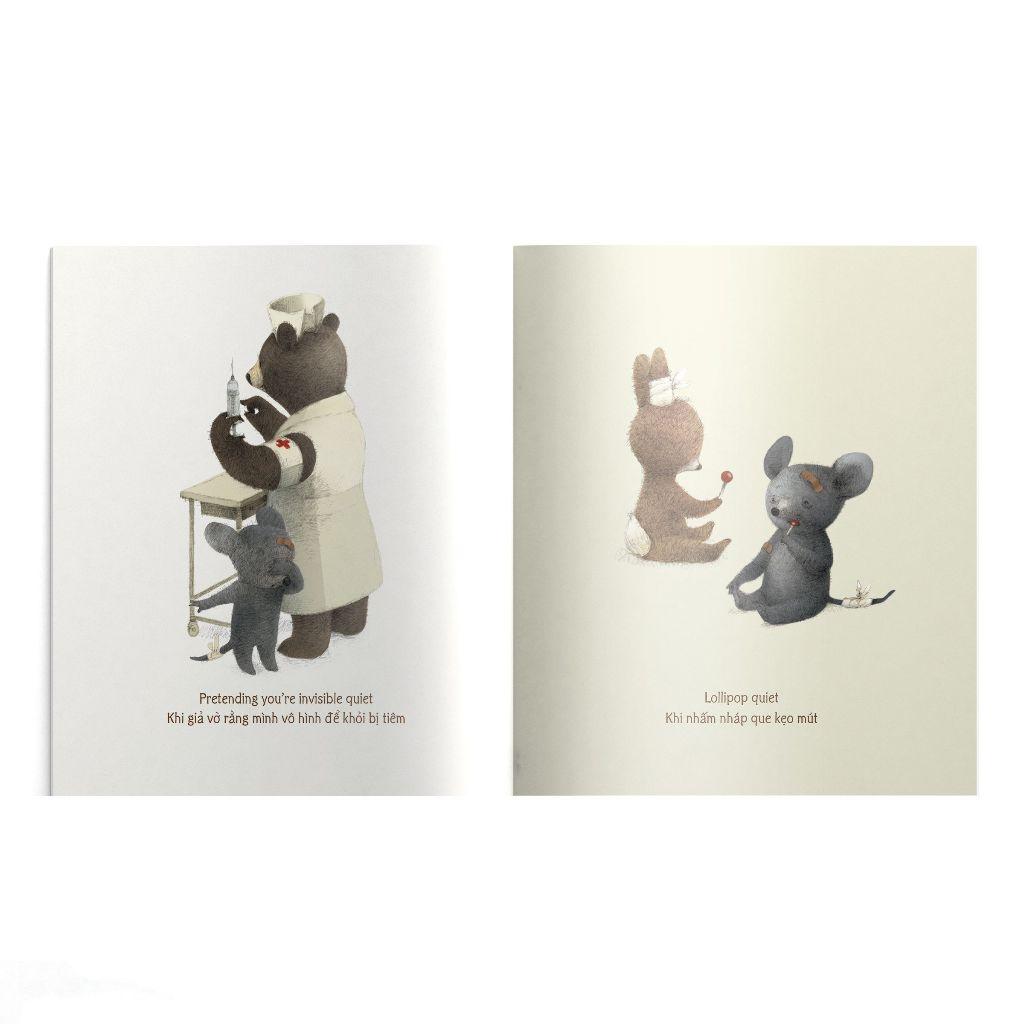 - Khoảnh khắc im lặng (Song ngữ Anh-Việt) Tác giả: Deborah Underwood biên soạn, Renata Liwska minh họa Dịch giả: Vi Hạ Kích thước: 21 x 25 cm Giá bìa: 55.000đ Số trang: 32 Trọng lượng: 200gr Mã ISBN: 978-604-378-379-7 Mã sản phẩm: 8936203363951 Hình thức: Bìa mềm, in màu toàn bộ Sách do Công ty Cổ phần Văn hóa Đông A và NXB Dân trí liên kết ấn hành NỘI DUNG SÁCH: Cuốn sách là bộ sưu tập những khoảng lặng mà bất kỳ ai cũng có thể bắt gặp trong đời: khi là người đầu tiên thức giấc, khi rỉ tai nhau những bí mật, khi chăm chú tô màu… Và còn những khoảnh khắc im lặng nào khác nữa, mời các em cùng khám phá nhé. “Những truyện kể trước giờ đi ngủ quá đỗi thú vị và hấp dẫn.” - School Library Journal Sách dành cho độ tuổi mầm non.