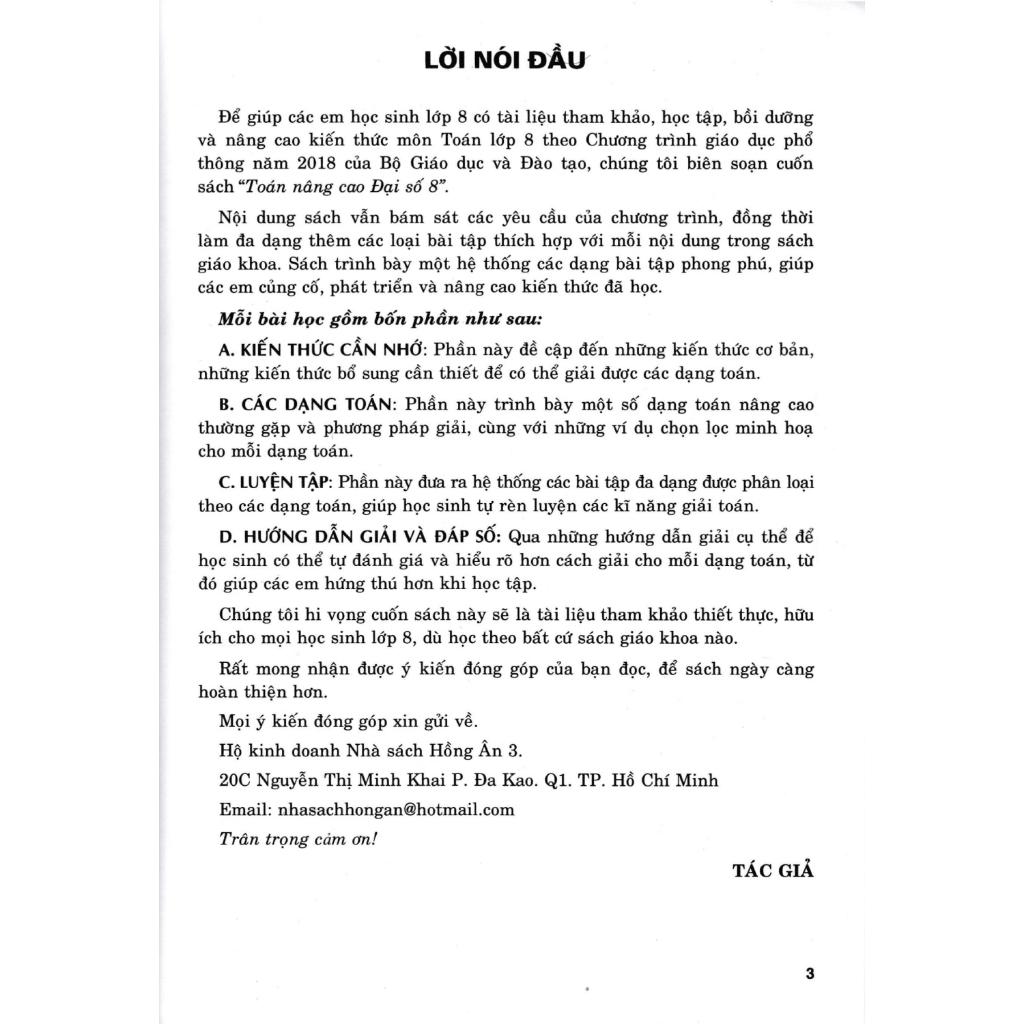 - Toán Nâng Cao Đại Số 8 (Dùng Chung Cho Các Bộ SGK Hiện Hành) Để giúp các em học sinh lớp 8 có tài liệu tham khảo, học tập, bồi dưỡng và nâng cao kiến thức môn Toán lớp 8 theo Chương trình giáo dục phổ thông năm 2018 của Bộ Giáo dục và Đào tạo, chúng tôi biên soạn cuốn sách “Toán nâng cao Đại số 8". Nội dung sách vẫn bám sát các yêu cầu của chương trình, đồng thời làm đa dạng thêm các loại bài tập thích hợp với mỗi nội dung trong sách giáo khoa. Sách trình bày một hệ thống các dạng bài tập phong phú, giúp các em củng cố, phát triển và nâng cao kiến thức đã học. Mỗi bài học gồm bốn phần như sau: A. KIẾN THỨC CẦN NHỚ: Phần này đề cập đến những kiến thức cơ bản, những kiến thức bổ sung cần thiết để có thể giải được các dạng toán. B. CÁC DẠNG TOÁN: Phần này trình bày một số dạng toán nâng cao thường gặp và phương pháp giải, cùng với những ví dụ chọn lọc minh hoạ cho mỗi dạng toán. C. LUYỆN TẬP: Phần này đưa ra hệ thống các bài tập đa dạng được phân loại theo các dạng toán, giúp học sinh tự rèn luyện các kĩ năng giải toán. D. HƯỚNG DẪN GIẢI VÀ ĐÁP SỐ: Qua những hướng dẫn giải cụ thể để học sinh có thể tự đánh giá và hiểu rõ hơn cách giải cho mỗi dạng toán, từ đó giúp các em hứng thú hơn khi học tập. Chúng tôi hi vọng cuốn sách này sẽ là tài liệu tham khảo thiết thực, hữu ích cho mọi học sinh lớp 8, dù học theo bất cứ sách giáo khoa nào.