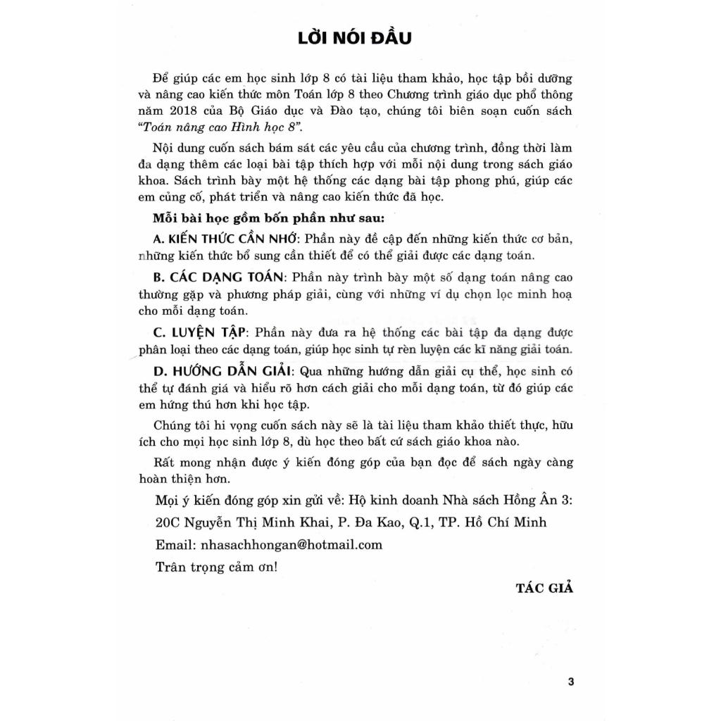 - Toán Nâng Cao Hình Học 8 (Dùng Chung Cho Các Bộ SGK Hiện Hành) Để giúp các em học sinh lớp 8 có tài liệu tham khảo, học tập bồi dưỡng và nâng cao kiến thức môn Toán lớp 8 theo Chương trình giáo dục phổ thông năm 2018 của Bộ Giáo dục và Đào tạo, chúng tôi biên soạn cuốn sách “Toán nâng cao Hình học 8”. Nội dung cuốn sách bám sát các yêu cầu của chương trình, đồng thời làm đa dạng thêm các loại bài tập thích hợp với mỗi nội dung trong sách giáo khoa. Sách trình bày một hệ thống các dạng bài tập phong phú, giúp các em củng cố, phát triển và nâng cao kiến thức đã học. Mỗi bài học gồm bốn phần như sau: A. KIẾN THỨC CẦN NHỚ: Phần này đề cập đến những kiến thức cơ bản, những kiến thức bổ sung cần thiết để có thể giải được các dạng toán. B. CÁC DẠNG TOÁN: Phần này trình bày một số dạng toán nâng cao thường gặp và phương pháp giải, cùng với những ví dụ chọn lọc minh hoạ cho mỗi dạng toán. C. LUYỆN TẬP: Phần này đưa ra hệ thống các bài tập đa dạng được phân loại theo các dạng toán, giúp học sinh tự rèn luyện các kĩ năng giải toán. D. HƯỚNG DẪN GIẢI: Qua những hướng dẫn giải cụ thể, học sinh có thể tự đánh giá và hiểu rõ hơn cách giải cho mỗi dạng toán, từ đó giúp các em hứng thú hơn khi học tập. Chúng tôi hi vọng cuốn sách này sẽ là tài liệu tham khảo thiết thực, hữu ích cho mọi học sinh lớp 8, dù học theo bất cứ sách giáo khoa nào. Rất mong nhận được ý kiến đóng góp của bạn đọc để sách ngày càng hoàn thiện hơn. Công ty phát hành: Nhà Sách Hồng Ân Năm Xuất Bản: 2024 Tác Giả: Nguyễn Thiện Chí Kích Thước: 17 x 24 cm Nhà Xuất bản: Đại Học Sư Phạm Số Trang: 180 Bìa: Mềm Barcode8935092836966