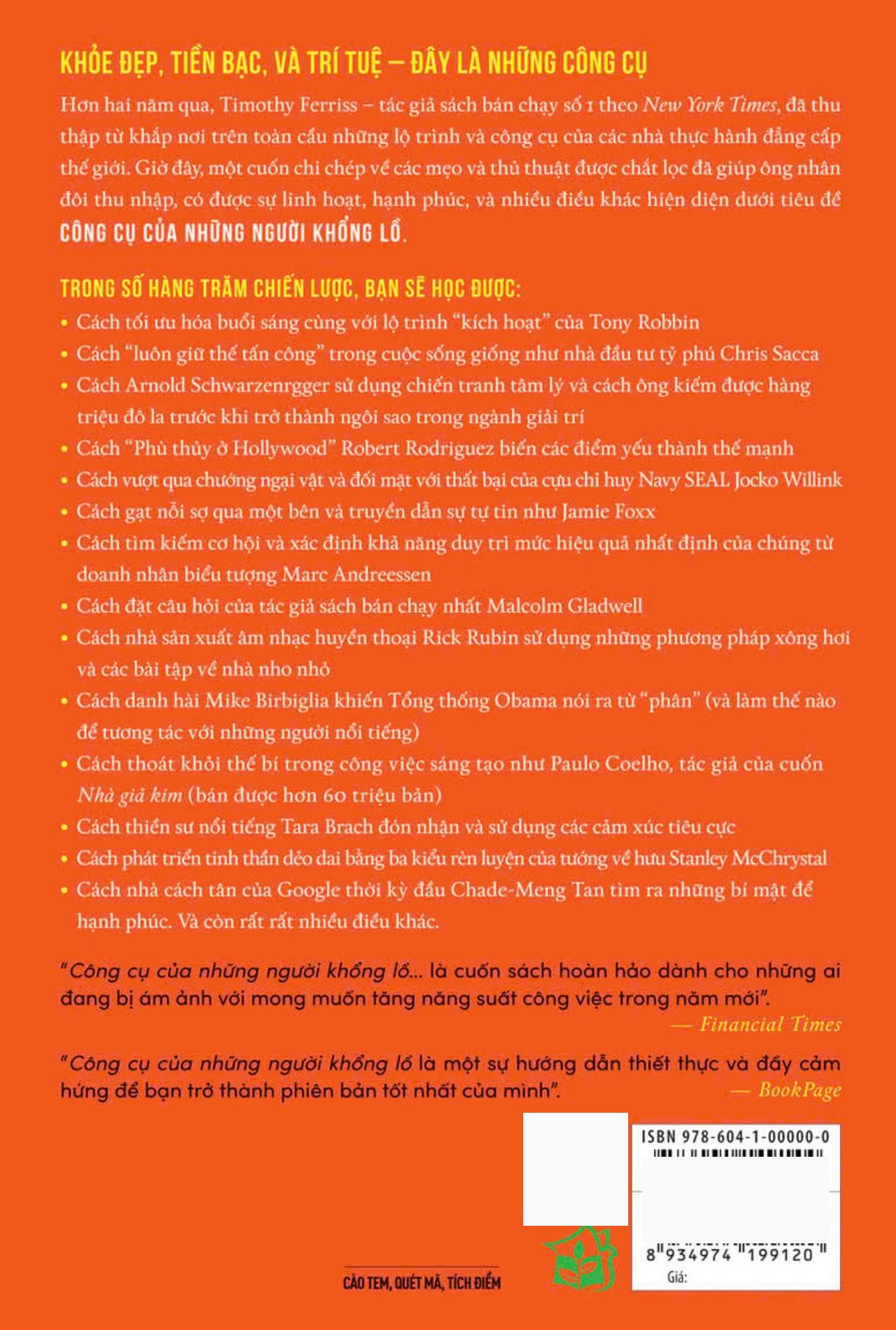 Timothy Ferriss - tác giả sách bán chạy số 1 theo New York Times, đã thu thập từ khắp nơi trên toàn cầu những lệ trình và công cụ của các nhà thực hành đẳng cấp thế giới. Giờ đây, một cuốn chi chép về các mẹo và thủ thuật được chắt lọc đã giúp ông nhân đôi thu nhập, có được sự linh hoạt, hạnh phúc, và nhiều điều khác hiện diện dưới tiêu đề CÔNG CỤ CỦA NHỮNG NGƯỜI KHỔNG LỒ.