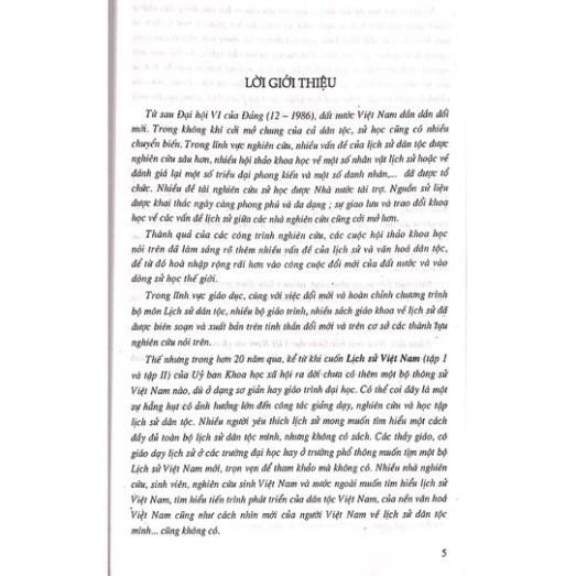 Nội dung : Từ sau Đại hội VI của Đảng ( 12 – 1986 ) , đất nước Việt Nam dần dần đổi mới . Trong không khí cởi mở chung của cả dân tộc , sử học cũng có nhiều chuyển biến . Trong lĩnh vực nghiên cứu , nhiều vấn đề của lịch sử dân tộc được nghiên cứu sâu hơn , nhiều hội thảo khoa học về một số nhân vật lịch sử hoặc về đánh giá lại một số triều đại phong kiến và một số danh nhân đã được tổ chức . Nhiều đề tài nghiên cứu sử học được Nhà nước tài trợ . Nguồn sử liệu được khai thác ngày càng phong phú và đa dạng ; sự giao lưu và trao đổi khoa học về các vấn đề lịch sử giữa các nhà nghiên cứu cũng cởi mở hơn. Thành quả của các công trình nghiên cứu , các cuộc hội thảo khoa học nói trên đã làm sáng rõ thêm nhiều vấn đề của lịch sử và văn hoá dân tộc , để từ đó hoà nhập rộng rãi hơn vào công cuộc đổi mới của đất nước và vào dòng sử học thế giới . Trong lĩnh vực giáo dục , cùng với việc đổi mới và hoàn chỉnh chương trình bộ môn Lịch sử dân tộc , nhiều bộ giáo trình , nhiều sách giáo khoa về lịch sử đã được biên soạn và xuất bản trên tinh thần đổi mới và trên cơ sở các thành tựu nghiên cứu nói trên . Thế nhưng trong hơn 20 năm qua , kể từ khi cuốn Lịch sử Việt Nam ( tập 1 và tập II ) của Uỷ ban Khoa học xã hội ra đời chưa có thêm một bộ thông sử Việt Nam nào , dù ở dạng sơ giản hay giáo trình đại học . Có thể coi đây là một sự hằng hạt có ảnh hưởng lớn đến công tác giảng dạy , nghiên cứu và học tập lịch sử dân tộc . Nhiều người yêu thích lịch sử mong muốn tìm hiểu một cách đầy đủ toàn bộ lịch sử dân tộc mình , nhưng không có sách . Các thầy giáo , cô giáo dạy lịch sử ở các trường đại học hay ở trường phổ thông muốn tìm một bộ Lịch sử Việt Nam mới , trọn vẹn để tham khảo mà không có . Nhiều nhà nghiên cứu , sinh viên , nghiên cứu sinh Việt Nam và nước ngoài muốn tìm hiểu lịch sử Việt Nam , tìm hiểu tiến trình phát triển của dân tộc Việt Nam , của nền văn hoá Việt Nam cũng như cách nhìn mới của người Việt Nam về lịch sử dân tộc mình cũng không có . NTBOOKS Chắp cánh tri thức - Vững bước tương lai