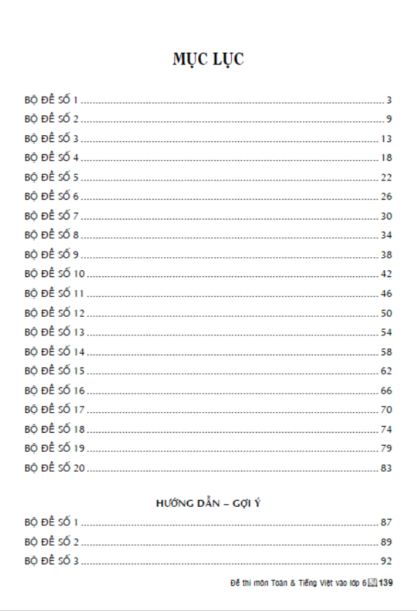 SÁCH - đề thi môn toán tiếng việt dùng cho học sinh lớp 5 thi vào lớp 6 (dùng chung cho các bộ sgk hiện hành) Vào cuối năm học, đặc biệt là năm cuối cấp, chúng ta sẽ được kiểm tra, đánh giá kết quả học tập và rèn luyện của bản thân. Với quyển "Đề thi môn Toán và Tiếng Việt vào lớp 6", hi vọng các em sẽ thuận tiện hơn cho việc ôn tập và rèn luyện; phát huy được những ưu điểm trong quá trình kiểm tra.