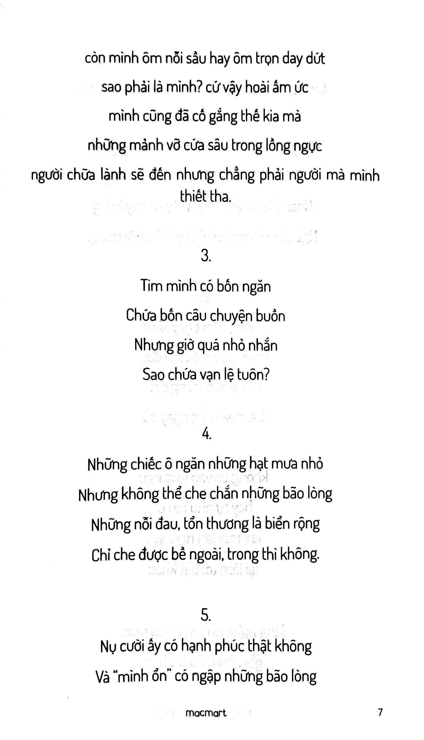 Điểm Rơi Nơi Đáy Mắt “Điểm rơi nơi đáy mắt” chứa đựng những lời thơ và câu văn đầy bất lực day dứt về một tuổi trẻ bị phủ bởi những vết xước mà cuộc sống này đem lại. Cuốn sách tựa sợi dây níu kéo bạn lại với thế giới này, tựa chiếc ôm ấm áp, đầy dịu dàng và thấu hiểu ôm lấy bạn nếu bạn đang: có những ngày mọi thứ làm bạn phát điên lên dù chỉ là một việc nhỏ; có những ngày bạn muốn chết quách đi cho rồi; có những ngày bạn sống mà ngỡ như đã chết; có những ngày bạn bị vùi lấp trong những cơn đau,... Dù có những lúc bạn không thấy ánh sáng cuối con đường, nhưng hy vọng vẫn luôn tồn tại. Đó là lý do vì sao bạn vẫn đang ở đây, vẫn tiếp tục tiến lên. Mọi thứ có thể thay đổi, có thể tốt đẹp hơn. Điều quan trọng là bạn không từ bỏ. Bạn xứng đáng có một tương lai tươi sáng hơn. Hãy nhớ rằng, bạn không cô đơn trong cuộc chiến này. Bạn là một phần quan trọng của thế giới, và thế giới cần bạn. Dù con đường có gập ghềnh, nhưng phía trước luôn có hy vọng, và bạn xứng đáng có được một cuộc sống trọn vẹn và hạnh phúc. “mong nhiều đêm cậu sẽ thôi thức trắng có một giấc ngủ ngon và yên lành mong mọi ngày bầu trời đều trong xanh để gió mang dịu dàng hôn mái tóc có những ngày chỉ mong cậu bật khóc cho gò má ướt đẫm mắt đỏ hoe để tầm nhìn đôi mắt nhỏ bị nhòe không thấy những đớn đau của thế giới cậu hãy mang nỗi buồn đi kí gửi vào làn gió hay làn nước dịu êm vào góc khuất cây lá phía ngoài thềm hay nén vào thốt ra bằng lời nói…”