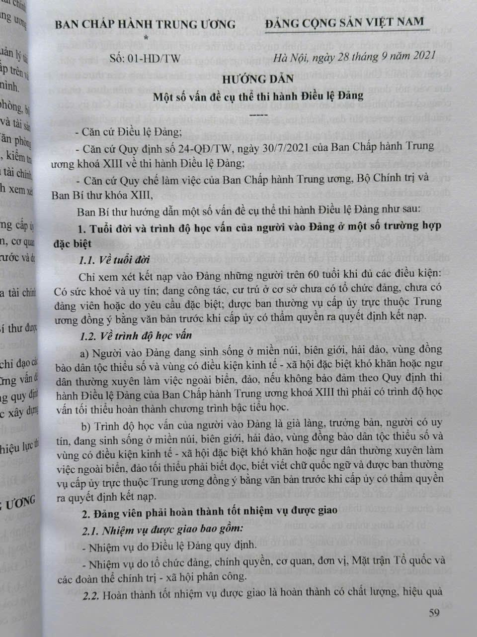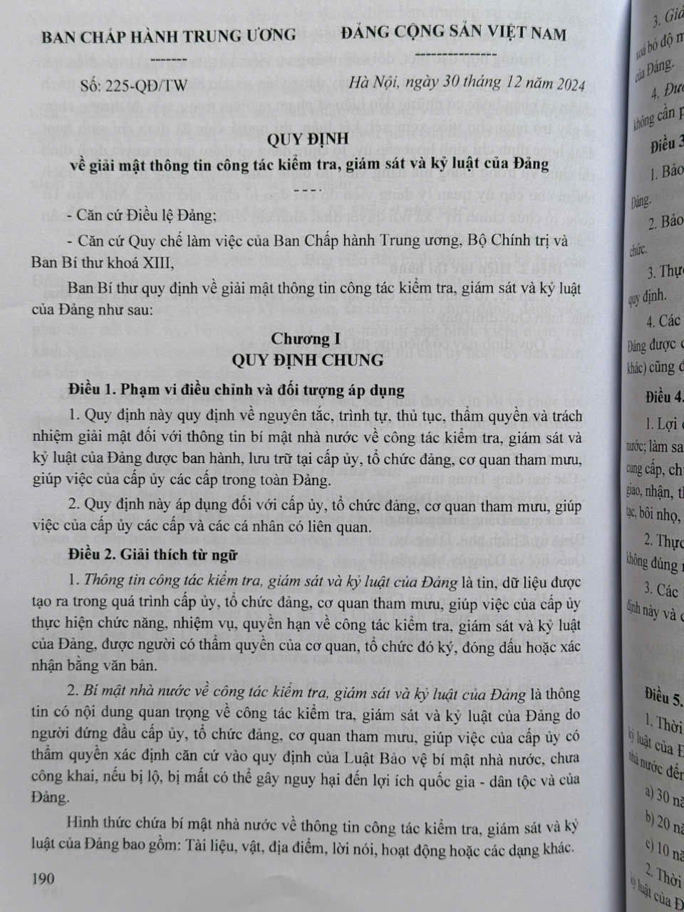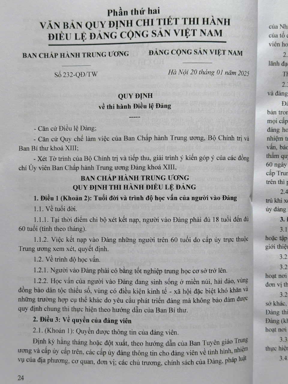 Nhằm hướng dẫn một số nội dung trong Điều lệ Đảng, vừa qua Ban Chấp hành Trung ương ban hành Quy định số 232-QĐ/TW ngày 20 tháng 01 năm 2025 của Ban Chấp hành Trung ương về thi hành Điều lệ Đảng trong đó quy định về tuổi đời và trình độ học vấn của người vào Đảng, quyền của đảng viên, giới thiệu và kết nạp người vào Đảng, thời hạn tổ chức lễ kết nạp đảng viên, xét công nhận đảng viên chính thức, tính tuổi đảng của đảng viên…
