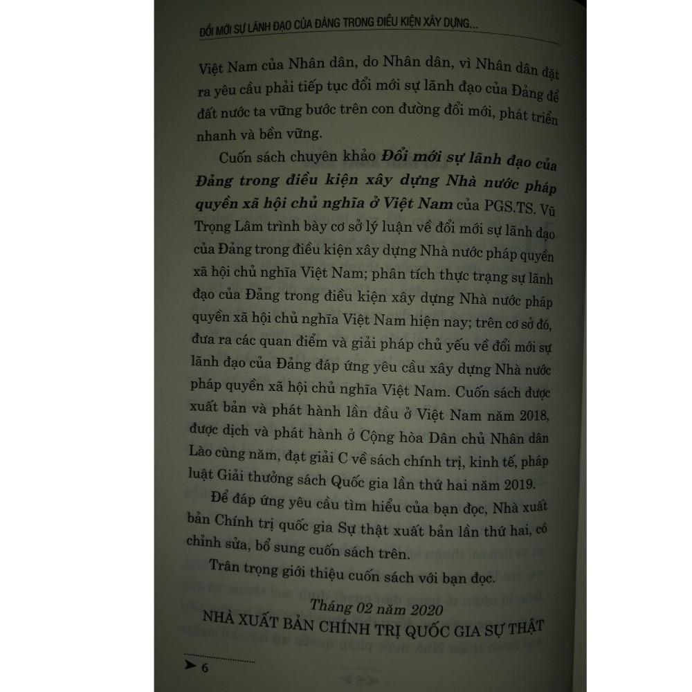 Cuốn sách chuyên khảo Đổi mới sự lãnh đạo của Đảng trong điều kiện xây dựng Nhà nước pháp quyền xã hội chủ nghĩa ở Việt Nam của PGS. TS. Vũ Trọng Lâm trình bày cơ sở lý luận về đổi mới sự lãnh đạo của Đảng trong điều kiện xây dựng Nhà nước pháp quyền xã hội chủ nghĩa Việt Nam; phân tích thực trạng sự lãnh đạo của Đảng trong điều kiện xây dựng Nhà nước pháp quyền xã hội chủ nghĩa Việt Nam hiện nay; trên cơ sở đó, đưa ra các quan điểm và giải pháp chủ yếu về đổi mới sự lãnh đạo của Đảng đáp ứng yêu cầu xây dựng Nhà nước pháp quyền xã hội chủ nghĩa Việt Nam.