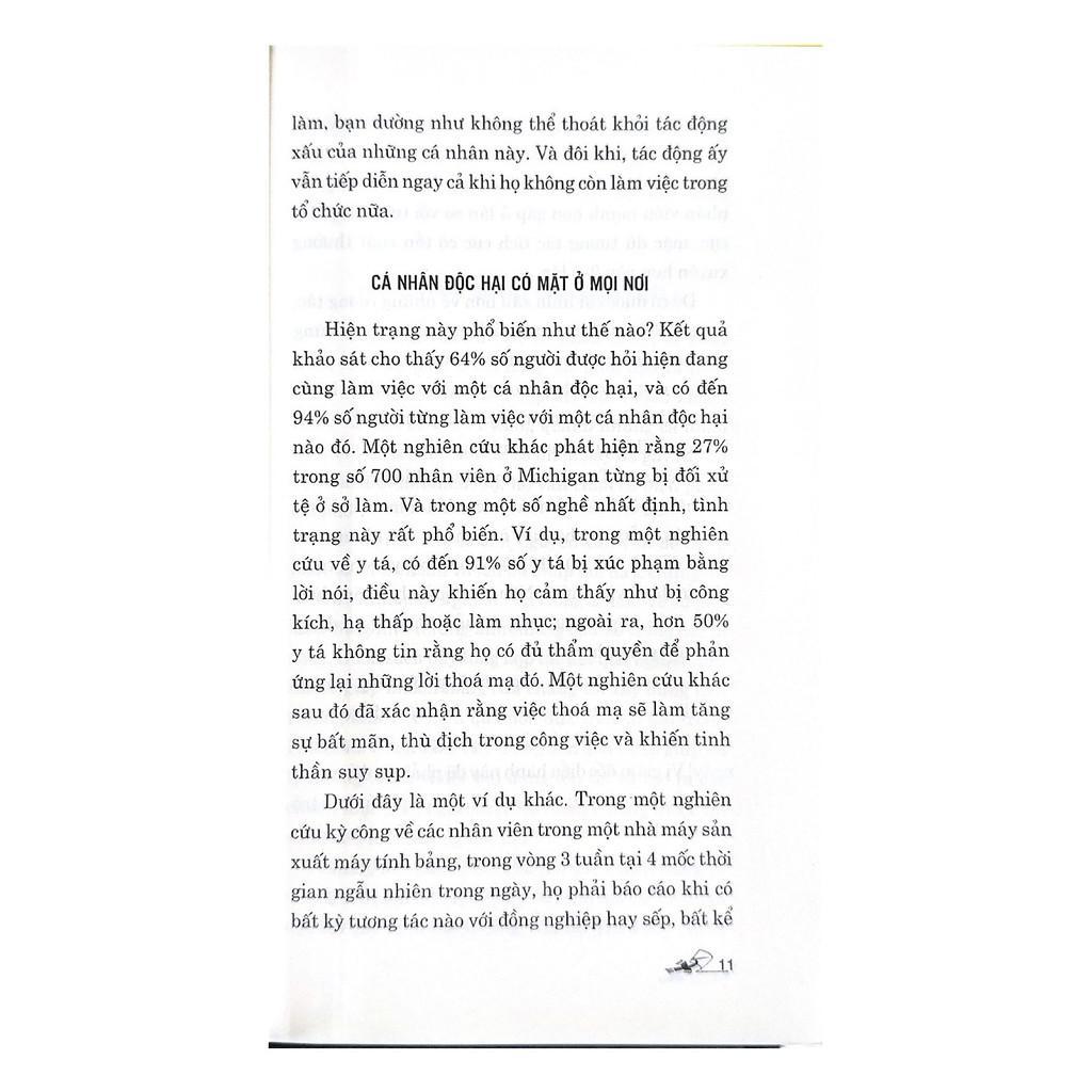 - Giới thiệu Cuốn sách ĐỐI PHÓ VỚI CÁ NHÂN ĐỘC HẠI Ở NƠI LÀM VIỆC của hai tác giả Mitchell Kusy và Elisabeth Holloway. Ở hai tiến sĩ này, nếu một người có hơn 25 kinh nghiệm trong vai trò lãnh đạo các tổ chức, đồng thời là cố vấn cho chương trình Lãnh đạo và Thay đổi của đại học Antioch. Còn người kia (Elisabeth Holloway) cũng tư vấn cho chương trình Lãnh đạo và Thay đổi của đại học Antioch. Theo nhận định của Gregg Steinhafel, chủ tịch kiêm CEO Target Corp: “Sách mô tả cách nhận diện và xử lý hiệu quả nhất những cá nhân độc hại, đồng thời cung cấp cách tiếp cận có hệ thống để tạo ra nền văn hóa tích cực và tôn trọng trong khi nâng cao lợi nhuận cho tổ chức. Kusy và Holloway chia sẻ phương pháp nghiên cứu trên phạm vi toàn quốc của họ vào thực tế tổ chức. Làm theo phương pháp cụ thể và thiết thực này sẽ tạo ra sự khác biệt đáng kể trong tổ chức.” Ông Frances Hesselbein, chủ tịch Viện Leader to Leader nêu nhận xét: “Sách Đối phó với cá nhân độc hại ở nơi làm việc chứa đựng quan điểm giá trị về những thách thức lớn mà các nhà lãnh đạo phải đối mặt trong tổ chức ngày nay. Đây là cuốn cẩm nang thiết thực cho các doanh nghiệp lành mạnh tương lai, không chỉ vì phương pháp tiếp cận hệ thống của Kusy và Holloway đối với cá nhân độc hại, mà còn vì cách thức độc đáo của họ trong việc tạo ra các cộng đồng gắn kết với nhau bằng sự tôn trọng, từ đó tác động đến trách nhiệm xã hội và lợi nhuận tổ chức