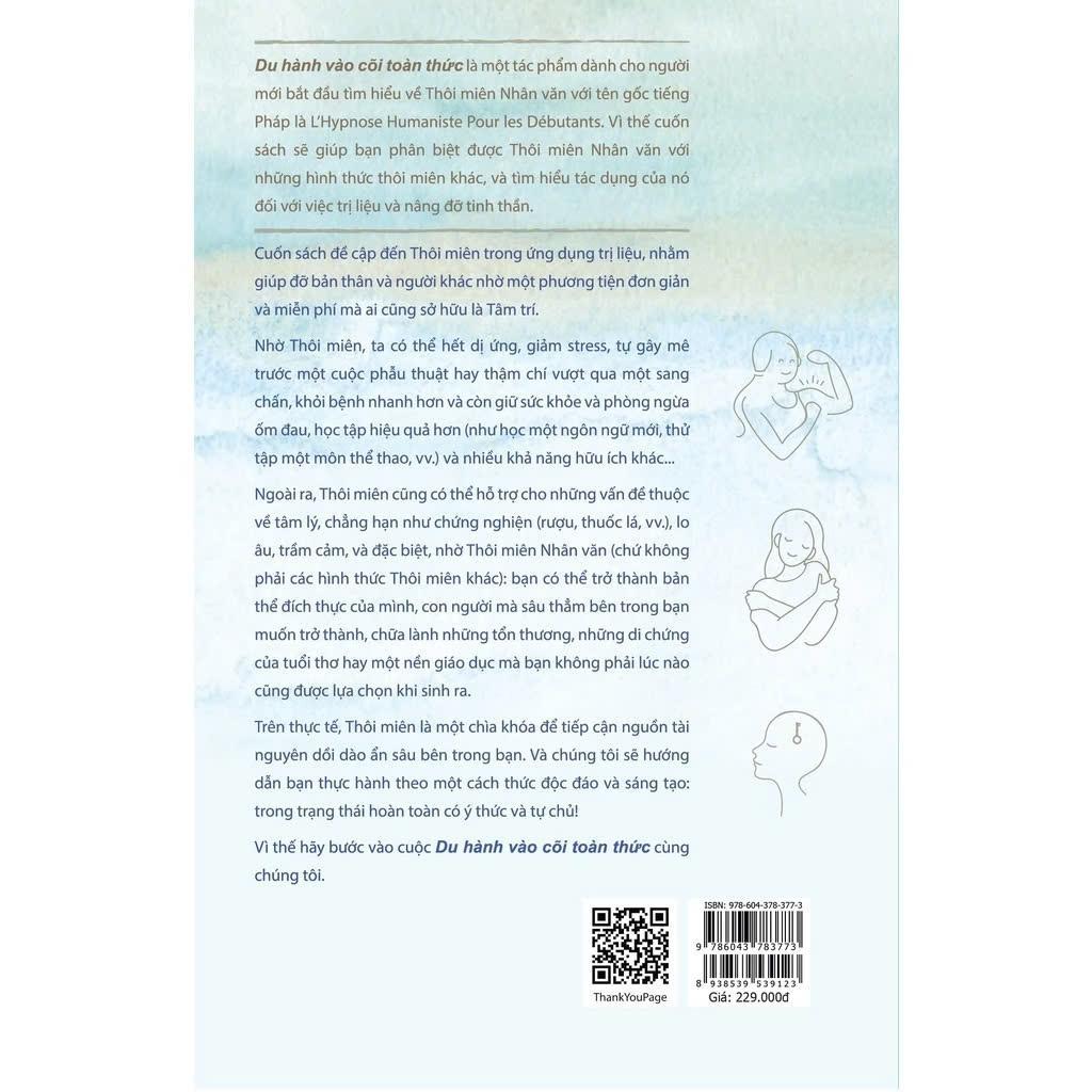 Sách - Du Hành Vào Cõi Toàn Thức Du hành vào cõi toàn thức là một tác phẩm dành cho người mới bắt đầu tìm hiểu về Thôi miên Nhân văn với tên gốc Pháp là L’Hypnose Humaniste Pour les Débutants. Vì thế cuốn sách sẽ giúp bạn phân biệt được Thôi miên Nhân văn với những hình thức thôi miên khác, và tìm hiểu tác dụng của nó đối với việc trị liệu và nâng đỡ tinh thần. Cuốn sách đề cập đến Thôi miên trong ứng dụng trị liệu, nhằm giúp đỡ bản thân và người khác nhờ một phương diện đơn giản và miễn phí mà ai cũng sở hữu là Tâm trí. Nhờ Thôimiên, ta có thể hết dị ứng, giảm stress, tự gây mê trước một cuộc phẫu thuật hay thậm chí vượt qua một sang chấn, khỏi bệnh nhanh hơn và còn giữ sức khoẻ và phòng ngừa ốm đau, học tập hiệu quả hơn (như học một ngôn ngữ mới, thử tập một môn thể thao…) và nhiều khả năng hữu ích khác… Ngoài ra, Thôi miên cũng có thể hỗ trợ cho những vấn đề thuộc về tâm lý, chẳng hạn như chứng nghiện (rượu, lá,…), lo âu, trầm cảm, và đặc biệt, nhờ Thôi miên Nhân văn (chứ không phải các hình thức Thôi miên khác): bạn có thể trở thành bản thể đích thực của mình, con người mà sâu thẳm bên trong bạn muốn trở thành, chữa lành những tổn thương, những di chứng của tuổi thơ hay một nền giáo dục mà bạn không phải lúc nào cũng được lựa chọn khi sinh ra. Trên thực tế, Thôi miên là một chìa khoá để tiếp cận nguồn tài nguyên dồi dào ẩn sâu bên trọng bạn. Và chúng tôi sẽ hướng dẫn bạn thực hành theo một cách thức độc đáo và sáng tạo: trong trạng thái hoàn toàn có ý thức và tự chủ! Vì thế hãy bước vào cuộc Du hành vào cõi toàn thức cùng chúng tôi. Về Tác Giả: Olivier Lockert là một nhà thôi miên trị liệu, coach và nhà văn từ hơn 30năm nay. Là người sáng lập Thôi miên Nhân văn với vợ là Patricia D'angeli, Olivier Lockert đã cùng bà quản lý Học viện Pháp về Thôi miên Nhân văn và Thôi miên kiểu Erickson (IFHE), tại Paris. Các khoá đào tạo của ông được tham khảo rộng rãi tại châu Âu cũng như ở nhiều quốc gia và nền văn hoá khác như Argentine, Canada, Nga, Trung Quốc, Maroc,... Olivier Lockert được đánh giá cao về kinh nghiệm thực tế và sự đơn giản trong việc truyền đạt những khái niệm trừu tượng, vô thức, toàn thức, vũ trụ… Patricia D'angeli là một nhà thôi miên trị liệu, chuyên về biểu tượng và tâm lý học chiều sâu. Bà là người đồng sáng lập IFHE với chồng Olivier Lockert . Bà cũng điều phối các hội thảo về tâm lý học xuyên thế hệ, cặp đôi, phân tích và giải mã giấc mơ,… tại Pháp, la Réunion, Nga… Bà là tác giả của một số cuốn sách, trong đó Liệu pháp tâm hồn: Chữa lành bằng Trị liệu biểu tượng Nâng cao đã được Thiện Tri Thức xuất bản. Patricia d’ Angeli được đánh giá cao vì trực giác tuyệt vời về ý nghĩa của những thông điệp vô thức, về các nguyên mẫu, tổn thương tâm lý , sự cân bằng của các khía cạnh tính nam và tính nữ trong mỗi chúng ta.