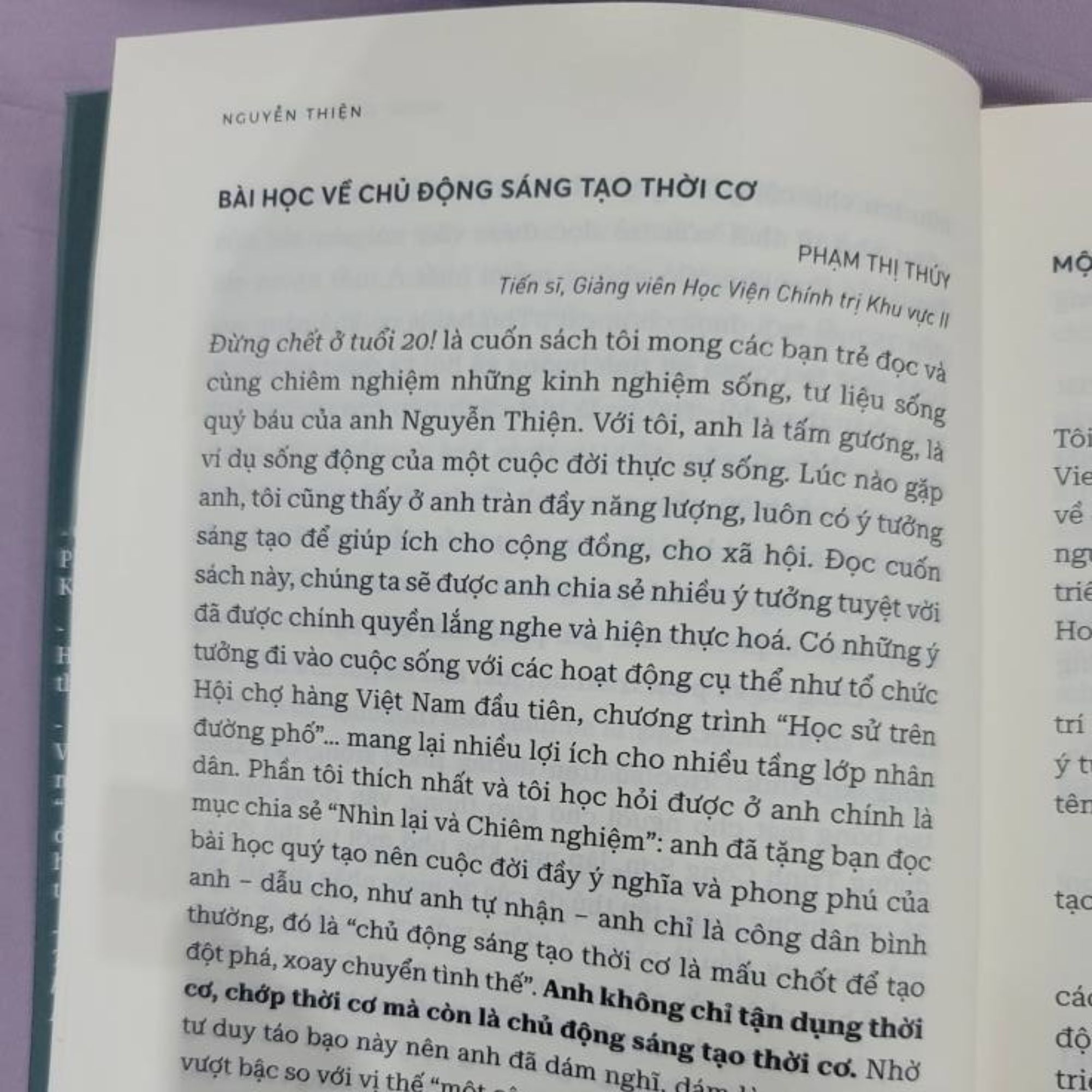 - Tác giả nhiều bài viết trên báo Tuổi Trẻ, Thời báo Kinh Tế Sài Gòn, Pháp Luật TP. Hồ Chí Minh… THÔNG TIN SẢN PHẨM Tên xuất bản phầm: Đừng chết ở tuổi 20! Tác giả: Nguyễn Thiện Khổ sách: 14.5 x 20.5 Bar: 8936219420655 ISBN: 978-632-618-810-3 Số trang: 176 trang GPPH: 601/QĐPH-NXBHNV Nhà xuất bản: Hội nhà văn Đơn vị phát hành: Công ty Cổ phần Xuất bản Khoa học và Giáo dục Thời Đại Thời gian phát hành: 09/2025 NỘI DUNG: Chết đây là cái chết tinh thần, là nguội lạnh bầu nhiệt huyết, là phai nhạt niềm đam mê, là không còn lửa. Tác giả tự nhủ: việc to tát, lớn lao theo gương các bậc vĩ nhân để cải cách, biến đổi xã hội thì e rằng mình không có khả năng, vậy thì hãy cố gắng làm những việc nhỏ mang lại giá trị cho cộng đồng theo kiến thức, sở trường, hoàn cảnh của mình. Nếu việc nhỏ mà có tính mới thì càng giá trị. Đừng chết ở tuổi 20! là cuốn tự thuật về 30 năm hoạt động xã hội không phải của một quan chức, cũng không phải một đại gia mà là của một công dân bình thường, kể lại những chuyện từ hiến kế cho Thủ tướng Võ Văn Kiệt vào tháng 7. 1995, Giải thưởng cuộc thi “TP. HCM nâng tầm quốc tế” cuối 2021, quá trình tổ chức các Chương trình như “Dân ta biết sử ta” đến Hội chợ Hàng Việt Nam đầu tiên tháng 9 năm 1996. MỤC LỤC Lời mở đầu