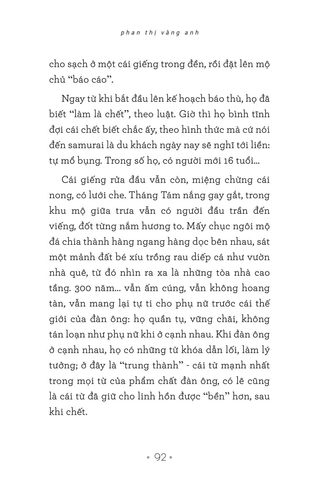 …Khi đã lùi xa khỏi sự kiện, tản văn của Phan Thị Vàng Anh là những bài học về phép ứng xử với cuộc sống, với chữ nghĩa, những thứ xem ra giới viết đã bàn nát nước nhưng làm được như thế lại là một chuyện khác, đòi hỏi không được buông tha sự quyết liệt của chính m.ình. Sự quyết liệt mà đa số chúng ta, sểnh ra là xẹp.”