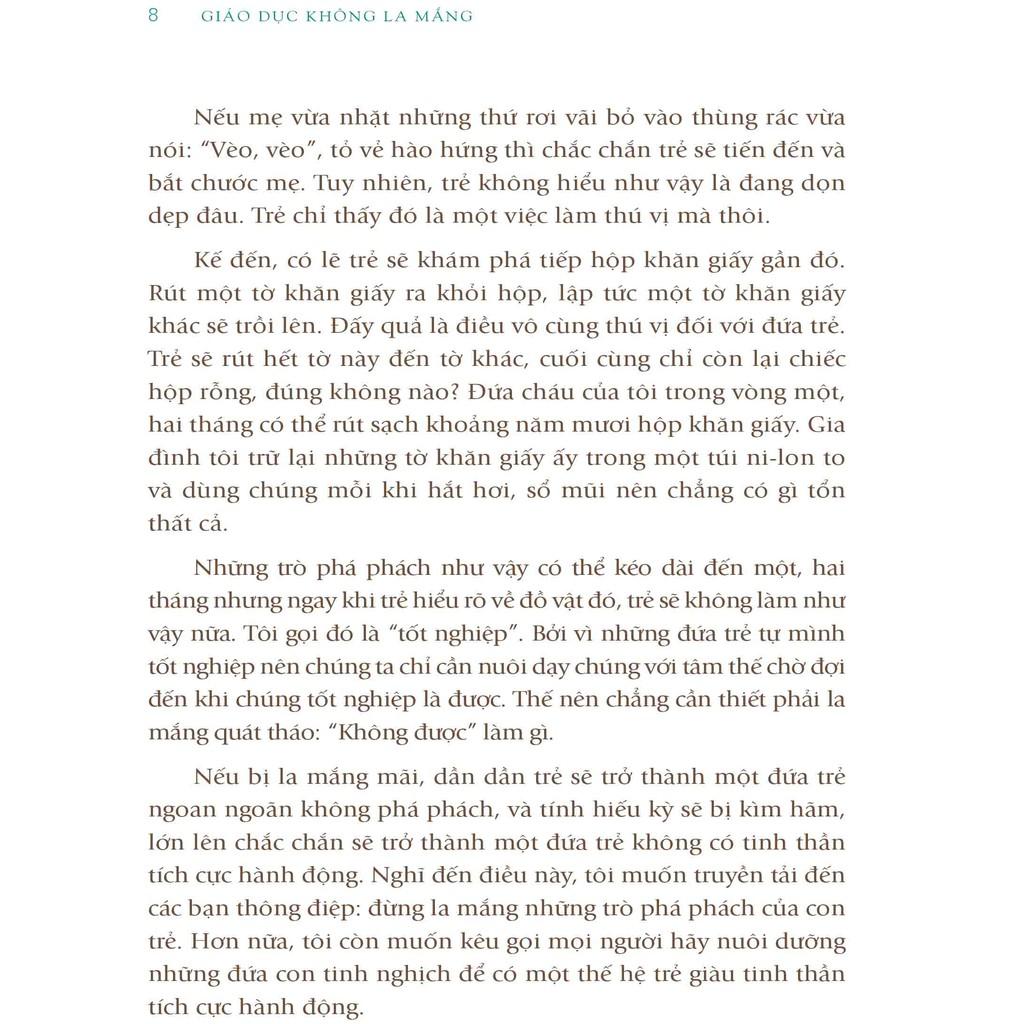 Những đứa trẻ được nuôi dưỡng “sự hăng hái” và “sự cảm thông” thì lớn lên sẽ trở thành những thanh niên ưu tú. Khi hoàn thành Giáo dục không la mắng, các bậc phụ huynh sẽ hiểu được rằng những trò phá phách là nuôi dưỡng tính hài hước và óc sáng tạo và hãy nhớ rằng hạnh phúc là khi trẻ được sống đúng như là một đứa trẻ.