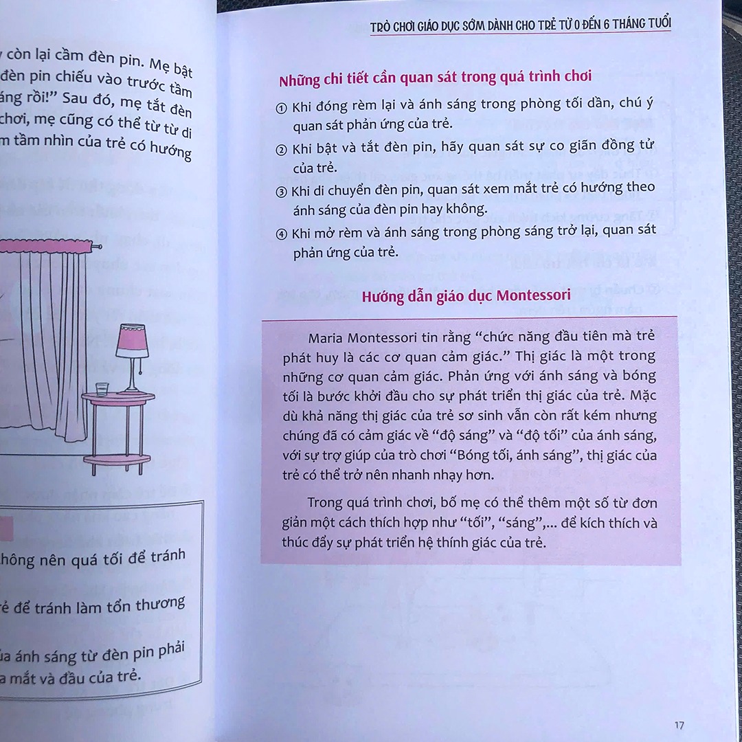 Sách: Giáo Dục Motessori Tại Nhà Maria Montessori từng nói:"Trẻ em sinh ra để học tập, phát triển cũng như cải thiện các hành vi, và chúng rất thích điều đó. Các nhà tâm lí học cho rằng trẻ em phải được vui chơi, bởi dưới sự trợ giúp của các trò chơi, sự phát triển của trẻ sẽ có xu hướng hoàn thiện hơn. Trẻ càng tâp trung cao độ thì càng kích thích đồng bộ giác gian, từ đó càng phát triển tư duy và hành động của mình." Giáo dục sớm theo phương pjasp Montessori bao gồm: