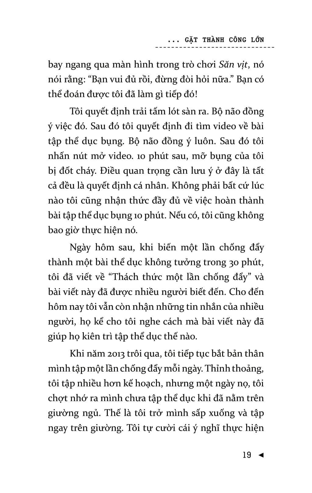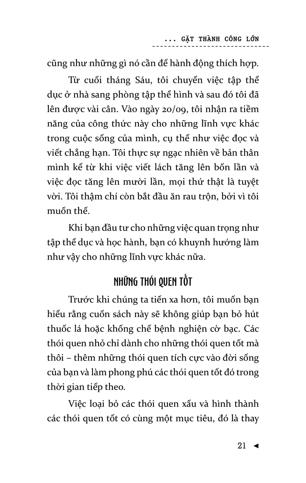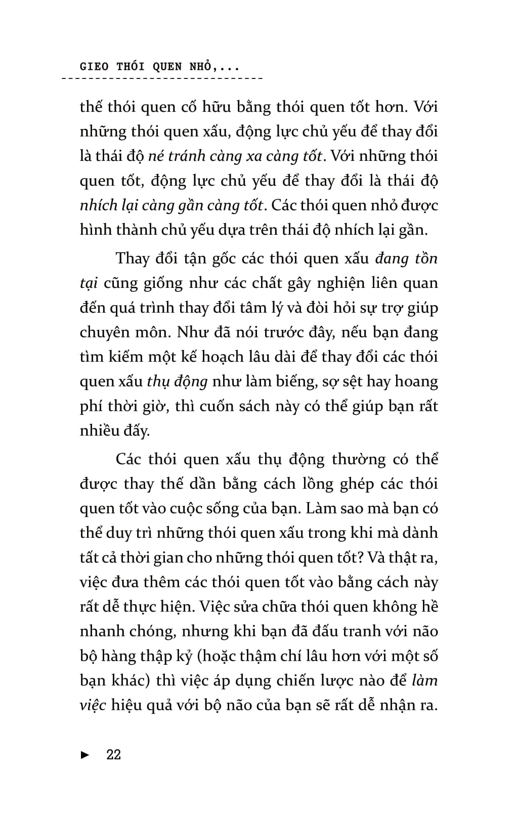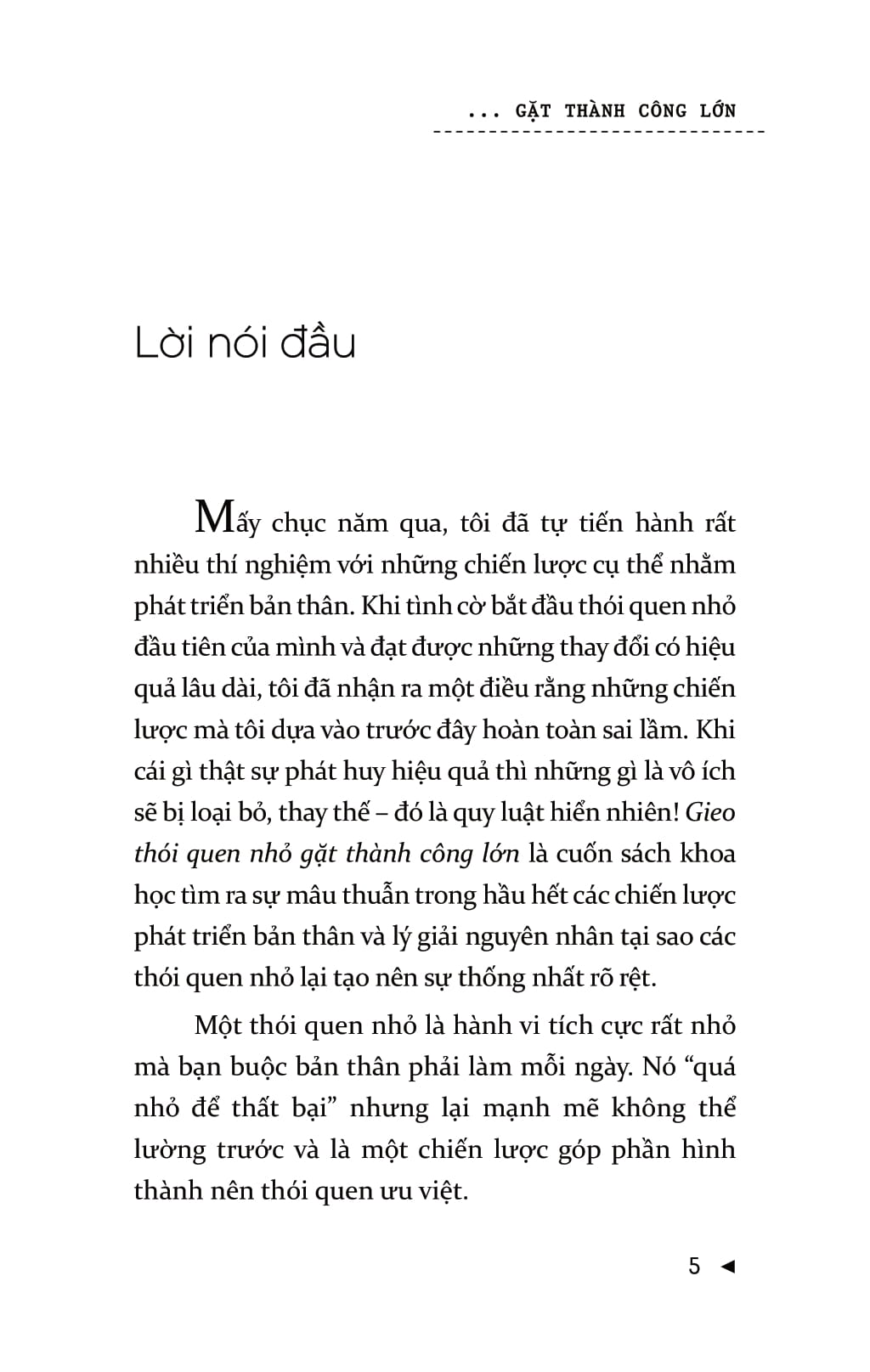 Mọi người thường nghĩ, chính họ là nguyên nhân khiến bản thân không thể đạt được sự thay đổi lâu dài. Nhưng vấn đề ở đây không phải là bản thân họ mà là chiến lược của họ. Bạn có thể đạt được những thành công to lớn mà không chịu bất cứ áp lực nào và sẽ không lặp lại thất bại nhờ những cách thức, phương pháp kiểu như: “lấy động lực”, sự kiên trì, và thậm chí là “làm đại đi”. Để đạt được những thay đổi lâu dài, bạn đừng cưỡng lại bộ não của mình. Khi bạn bắt đầu làm theo những chỉ thị của não bộ – theo dẫn dắt từ Gieo thói quen nhỏ gặt thành công lớn – thì những thay đổi tích cực, lâu dài sẽ không khó để đạt được! Gieo thói quen nhỏ gặt thành công lớn là cuốn sách khoa học tìm ra sự mâu thuẫn trong hầu hết các chiến lược phát triển bản thân và lý giải nguyên nhân tại sao các thói quen nhỏ lại tạo nên sự thống nhất rõ rệt. Một thói quen nhỏ là hành vi tích cực rất nhỏ mà bạn bắt bản thân phải làm mỗi ngày. Nó “quá nhỏ để thất bại” nhưng lại mạnh mẽ không thể lường trước và là một chiến lược góp phần hình thành nên thói quen ưu việt.Cuốn sách gồm có bảy phần chính. Ba phần đầu của cuốn sách bàn về việc xây dựng thói quen, bộ não, ý chí, động lực và chỉ ra cách chúng liên hệ với nhau. Hai phần tiếp theo bàn về các kết luận mang tính lô-gic và cách khai thác một cách khoa học nhất những thông tin cung cấp. Ba phần cuối hướng dẫn bạn áp dụng những cách thức đó trong cuộc sống.Chiến lược này sẽ giúp cuộc sống của bạn trở nên hoàn hảo hơn 99% số người sống trên hành tinh này.