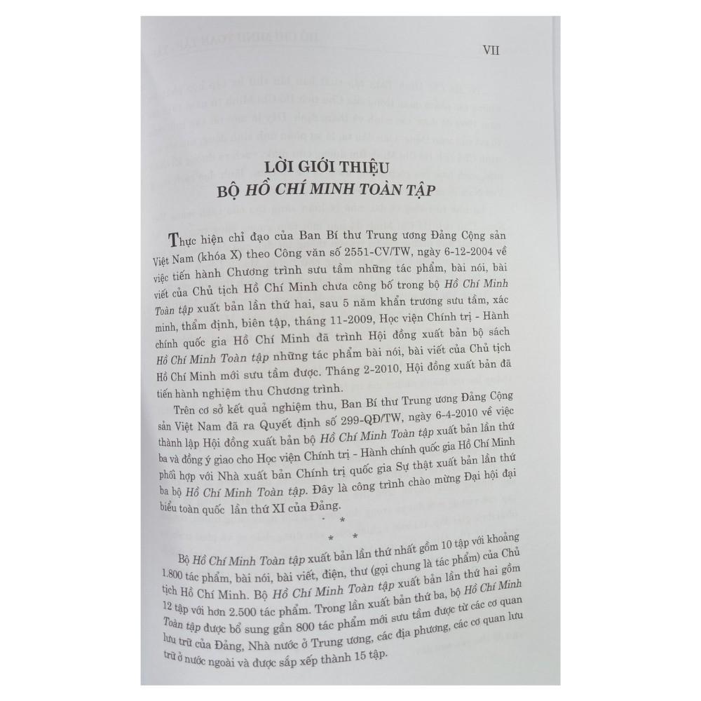 Mua tại TiktokNXB Chính Trị Quốc Gia Sự Thật Tác giả: Hồ Chí Minh Năm xuất bản: Tháng 5-2021 Số trang: 9750 Bộ Hồ Chí Minh toàn tập xuất bản lần thứ ba năm 2021, do Nhà xuất bản Chính trị Quốc gia Sự thật Xuất bản và phát hành, được bổ sung gần 800 tác phẩm mới sưu tầm được từ các cơ quan lưu trữ của Đảng, Nhà nước ở Trung ương và các địa phương, các cơ quan lưu trữ ở nước ngoài, được sắp xếp thành 15 tập, với những nội dung chính như sau: