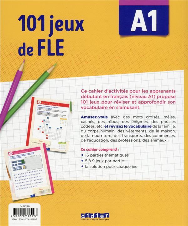 Les points forts de la collection : - Réviser et approfondir le vocabulaire des niveaux A1 et A2 - S'amuser avec une grande variété de typologies d'activités ludiques : mots croisés, mêlés, cachés, des rébus, des énigmes, des phrases codées, etc. - Revoir le lexique de 16 thématiques pour chaque niveau. Retrouver la solution sur la page de chacun des 101