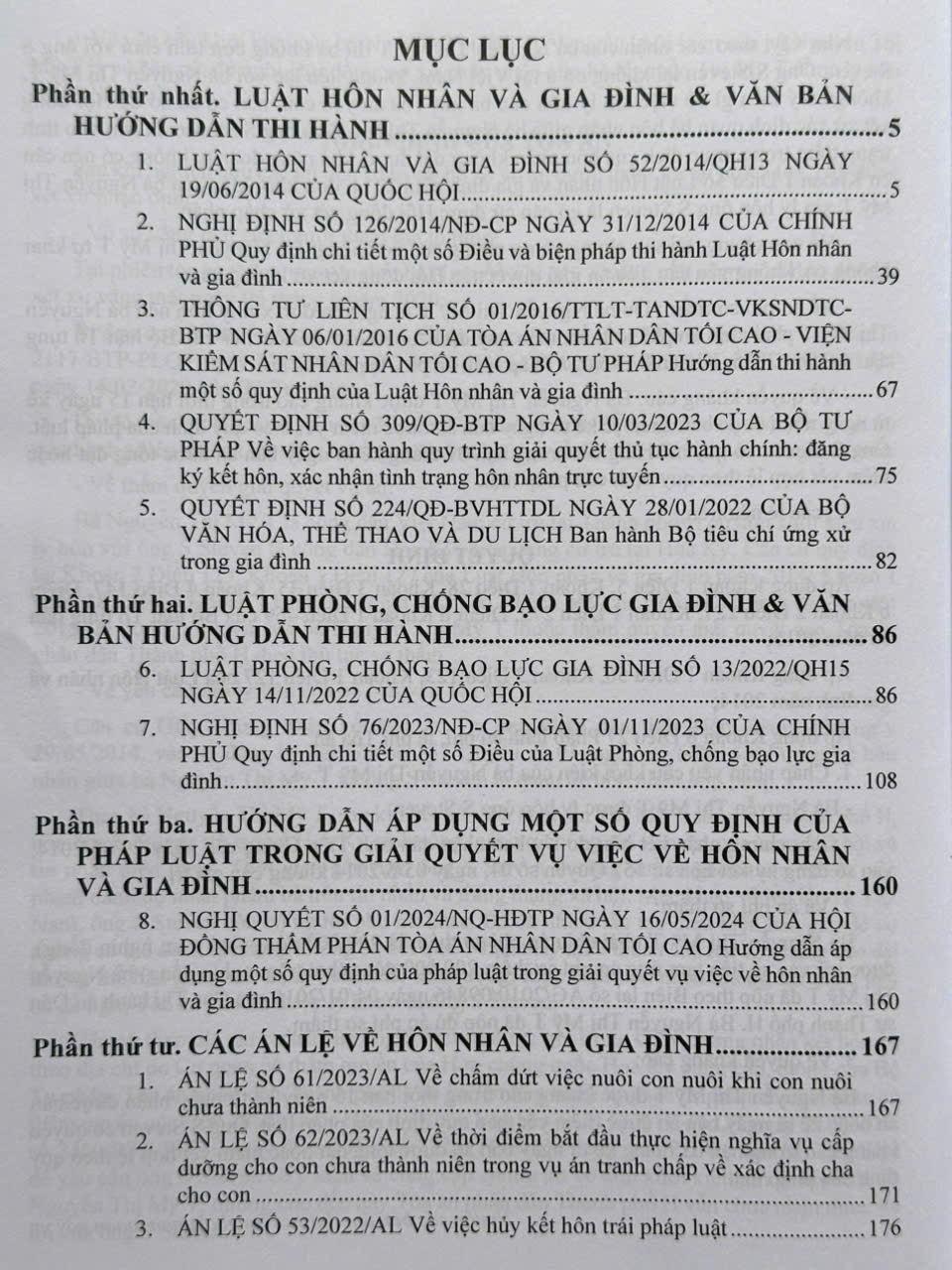 Mục lục: Chương 1: Những quy định chung Chương 2: Kết hôn Chương 3: Quan hệ giữa và chồng Chương 7: Cấp dưỡng Chương 8: Quan hệ hôn nhân và gia đinh có yếu tố