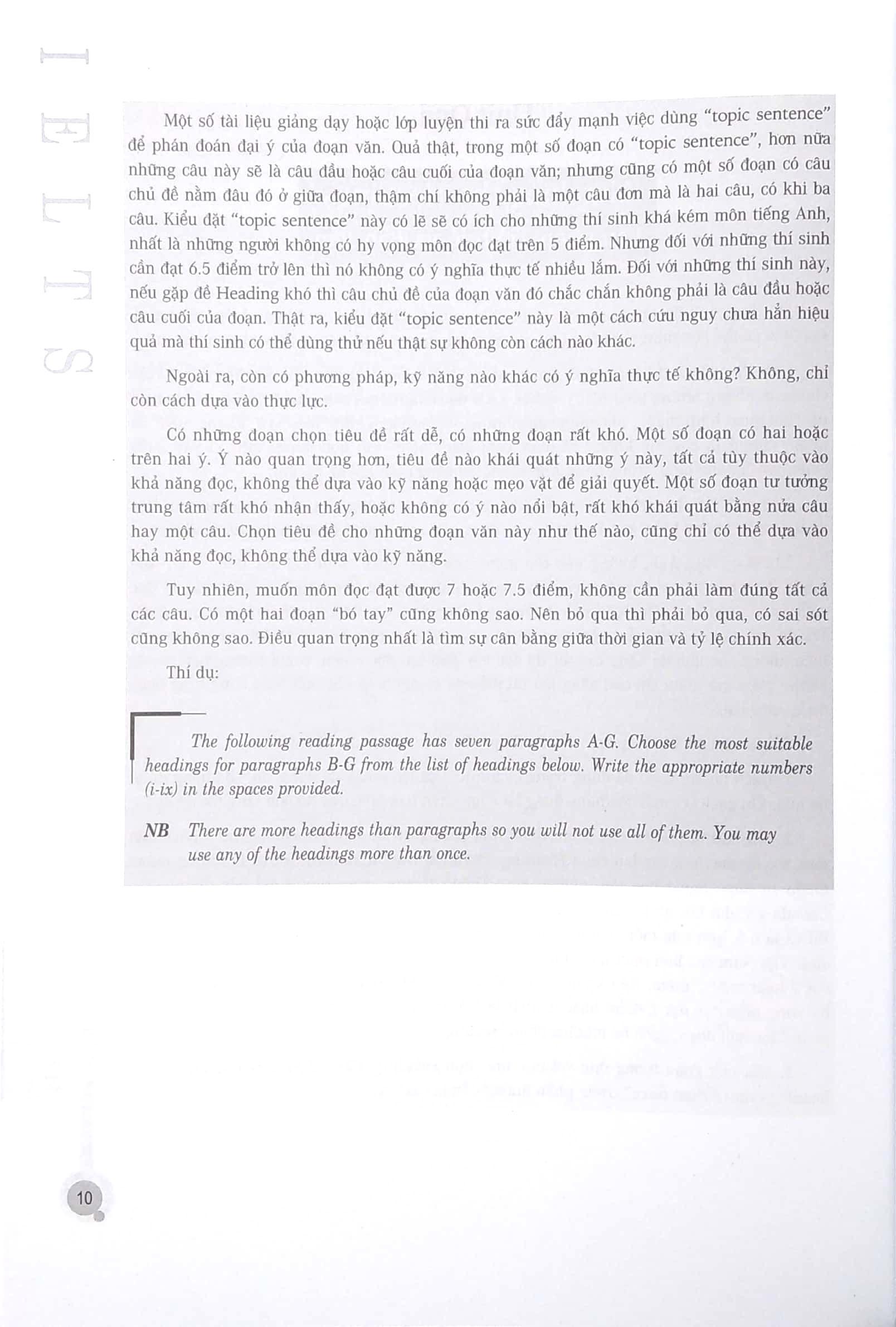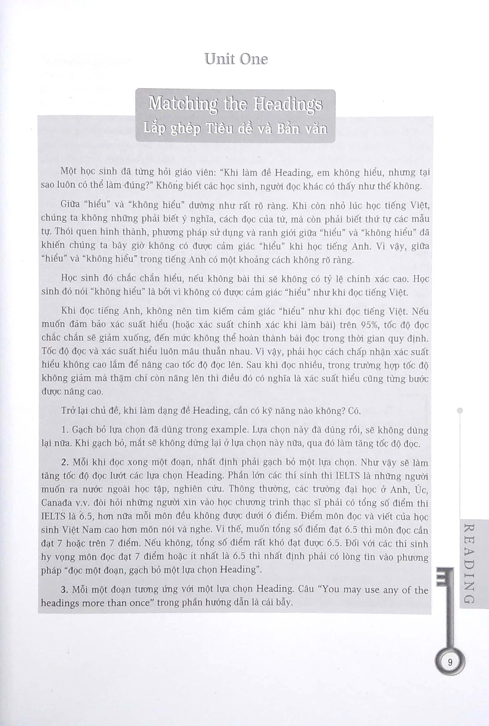 IELTS Reading Strategies For The IELTS Test Giáo trình này tổng cộng có hơn 80 bài đọc, sau khi phân tích tỉ mỉ các đề thi IELTS, chúng tôi chia các bài đọc này thành 7 phần theo các dạng đề luyện đọc: Matching the Headlings (Lắp ghép tiêu đề văn bản), Cloze (Điền ô trống), Multiple Choice (Chọn lựa nhiều mục), Summarizing (Tóm tắt), YES/ NO/ NOT GIVEN (Đúng, sai, không đề cập), Scanning for Answers (Tìm nhanh đáp án) và Integrated Exercises (Bài tập tổng hợp). Mặc dù người đọc không cần phải theo thứ tự này, nhưng dạng đề của phần bài tập tổng hợp đa dạng hơn, do đó hãy làm quen với các dạng đề thi trước rồi làm phần này sau. Phần bài thi mẫu trong cuốn sách này tổng cộng có 6 đề. Theo các thí sinh đã từng làm các đề thi này và tham dự kỳ thi IELTS, các đề này khó hơn và dài hơn đề thi thực tế một chút, nhưng dạng đề không có sự khác biệt. Đây cũng là chủ ý của tác giả khi biên soạn các đề thi này. Người đọc có thể làm các đề này theo yêu cầu thực tiễn ở từng gia đoạn để quan sát sự tiến bộ và xác định những khó khăn của m.ình. Bài đọc trong các kỳ thi IELTS khác với bài đọc tiếng Anh thường ngày và bài đọc trong các kỳ thi tiếng Anh khác. Thông thường, đọc là một phương thức thu thập thông tin, còn các bài đọc trong kỳ thi IELTS là thông qua việc đọc để giải quyết các vấn đề cụ thể. Nó cách khác, thông qua việc đọc để tìm ra đáp án của câu hỏi. Trong quá trình học và sử dụng tiếng Anh nhiều năm, các họ sinh phần nào hình thành các đọc riêng của m.ình. Những cách đọc này có lẽ rất hiệu quả trong học tập và công việc, nhưng khi áp dụng vào bài thi đọc IELTS có thể họ sẽ gặp khó khăn bởi các yếu tố như thời gian có hạn, dạng đề đặc biệt …. Vì vậy, tác giả đề nghị khi làm bài tập trong cuốn sách này, trước hết phải hiểu chỉ dẫn (instruction), làm rõ nhiệm vụ (task), cần biết phải hoàn thành trong thời gian bao lâu (suggested time), sau đó bắt đầu đọc. Trong cuốn sách này, người đọc cần chú trông việc nâng cao kỹ năng đọc, đồng thời tìm ra cách đọc thích hợp với từng dạng đề.