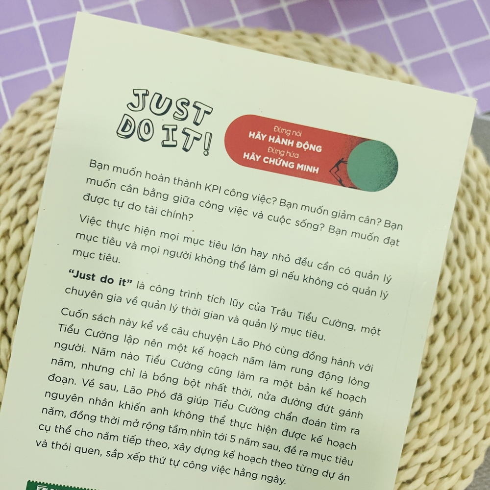 - Biết cách thực hiện nhưng lại không làm được Vậy những phiền não này bắt nguồn từ đâu? Làm thế nào để xoá bỏ được chúng? Thông qua trải nghiệm của chính mình, tác giả đã tìm ra câu trả lời cho những câu hỏi trên chính là: thiết lập một kế hoạch thúc đẩy động lực, tạo nên tâm thái “hãy cứ làm đi” để xoá tan sự lo lắng và căng thẳng trong tâm hồn. Nội dung cuốn sách Just do it - Đừng nói hãy hành động, đừng hứa hãy chứng minh Cuốn sách được chia làm 5 chương: Chương 1: Viết một bức thư gửi chính mình của năm năm sau Chương 2: Để ước mơ đi vào hiện thực Chương 3: Ngẩng đầu nhìn đường và cúi đầu đi đường Chương 4: Làm thế nào để nuôi dưỡng một thói quen tốt? Chương 5: Sống một ngày như thế nào thì sống cả năm như thế đấy Không phải lối hành văn nhàm chán và cũ kỹ như những cuốn sách về xây dựng kế hoạch khác, xuyên suốt 5 chương sách là câu chuyện của Tiểu Cường – một chàng trai 30 tuổi làm nghề IT, năm nào cũng đề ra cho mình một bản kế hoạch năm siêu hoành tráng, nhưng năm nào anh cũng chỉ duy trì bản kế hoạch được một thời gian rồi nửa đường đứt gánh. Chưa bao giờ anh có thể hoàn thành hết những mục tiêu mà mình đã đặt ra. Về sau, Lão Phó – vị sếp cũ của Tiểu Cường, đã cùng đồng hành với anh lập nên một kế hoạch năm làm “rung động lòng người”. Lão Phó giúp Tiểu Cường tìm ra nguyên nhân khiến anh không thể thực hiện được kế hoạch năm, đồng thời mở rộng tầm nhìn tới 5 năm sau, đề ra mục tiêu cụ thể cho năm tiếp theo, xây dựng kế hoạch theo từng dự án và thói quen, sắp xếp thứ tự công việc hằng ngày.