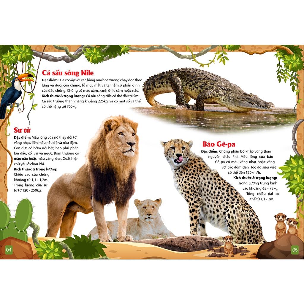 Đây là bộ sách giới thiệu về các loài động vật 5 châu lục gồm: Châu Á, Châu Âu, Châu Mỹ, Châu Úc, Châu Phi. Nội dung viết một cách khái quát, cơ bản về đặc điểm nhận dạng, trọng lượng và kích thước của mỗi loài. Những loài vật tiêu biểu ở mỗi châu lục được chọn sắp xếp một cách tương đối, không theo một tiêu chí chính xác tuyệt đối nào.