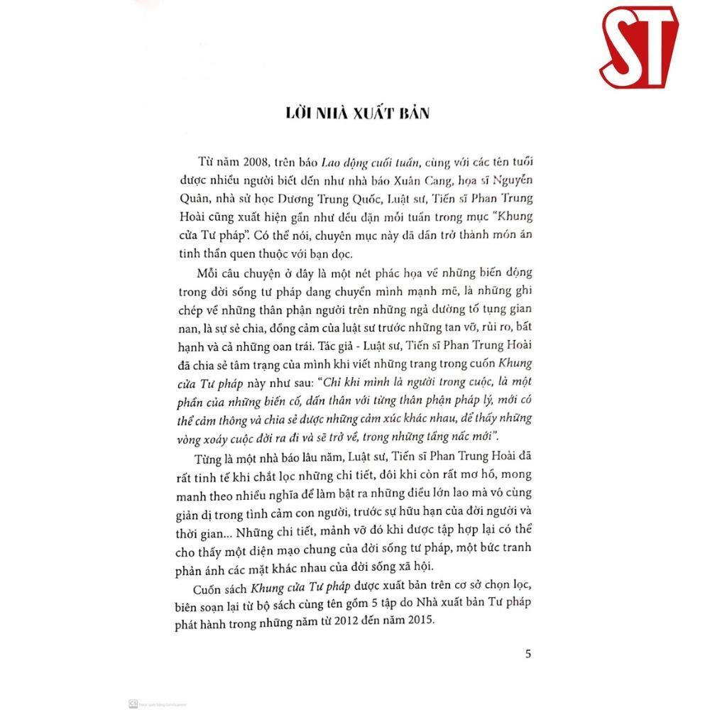 Nhà xuất bản Chính trị quốc gia Sự thật Tác giả: Luật sư - Tiến sĩ Phan Trung Hoài Năm xuất bản: 2022 Số trang: 436 Cuốn sách Khung cửa Tư pháp được xuất bản trên cơ sở chọn lọc, biên soạn lại từ bộ sách cùng tên gồm 5 tập do Nhà xuất bản Tư pháp phát hành trong những năm từ 2012 – 2015. Mỗi câu chuyện ở đây là một nét phác hoạ về những biến động trong đời sống tư pháp đang dần chuyển mình mạnh mẽ, là ghi chép về những thân phận người trên những ngả đường tố tụng gian nan, là sự sẻ chia, đồng cảm của luật sư trước những tan vỡ, rủi ro, bất hạnh và cả những oan trái.