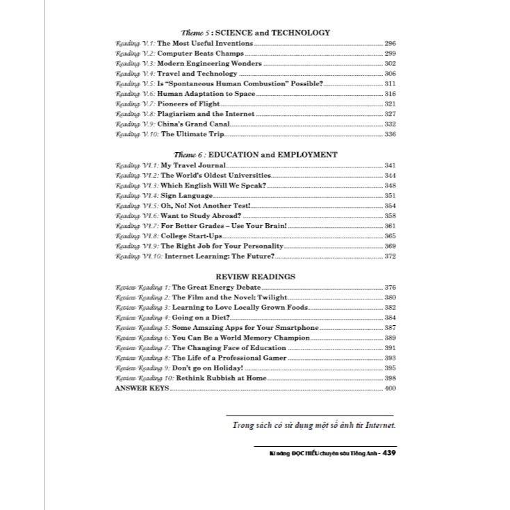 Các bài đọc được chia thành những chủ đề thường gặp trong các đề thi như: Our Society (Xã hội của chúng ta); Our Culture (Nền văn hóa của chúng ta);