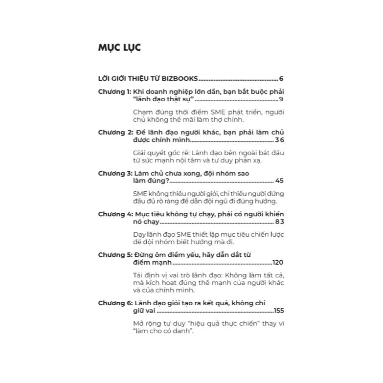Lãnh Đạo Thật Đừng Chỉ Ngồi Ghế – Cách người điều hành xuất sắc tạo ảnh hưởng, dẫn dắt và bứt phá đội ngũ Lãnh Đạo Thật Đừng Chỉ Ngồi Ghế là cuốn sách thực tiễn và đầy cảm hứng dành cho các nhà lãnh đạo muốn bứt phá. Brian Tracy chỉ ra rằng một nhà điều hành xuất sắc không chỉ ngồi yên ra lệnh, mà cần tạo ảnh hưởng tích cực, xây dựng niềm tin và đồng hành cùng đội ngũ để vượt qua thử thách. Cuốn sách đi sâu vào: Kỹ năng giao tiếp, truyền cảm hứng và định hướng rõ ràng Xây dựng tinh thần gắn kết, tạo động lực cho nhân viên Quản lý xung đột và ra quyết định hiệu quả Phát triển văn hóa doanh nghiệp mạnh mẽ, bền vững Với phong cách viết dễ hiểu, giàu kinh nghiệm thực chiến, Brian Tracy mang đến cho bạn những công cụ thiết thực để trở thành một nhà lãnh đạo thực thụ — dám bước ra khỏi chiếc ghế chỉ huy và đồng hành cùng đội ngũ chinh phục những mục tiêu lớn. Cuốn sách phù hợp cho: Chủ doanh nghiệp, CEO Nhà quản lý cấp trung và cấp cao Người muốn nâng cao kỹ năng lãnh đạo Những ai khao khát phát triển đội nhóm vững mạnh Thông tin chi tiết cuốn sách Mã sản phẩm : 8935246957554 Năm xuất bản : 2025 Nhà xuất bản : Hồng Đức Tác giả : Brian Tracy Kích thước : 14 x 20,5 cm Số trang : 256 Công ty phát hành : Bizbooks