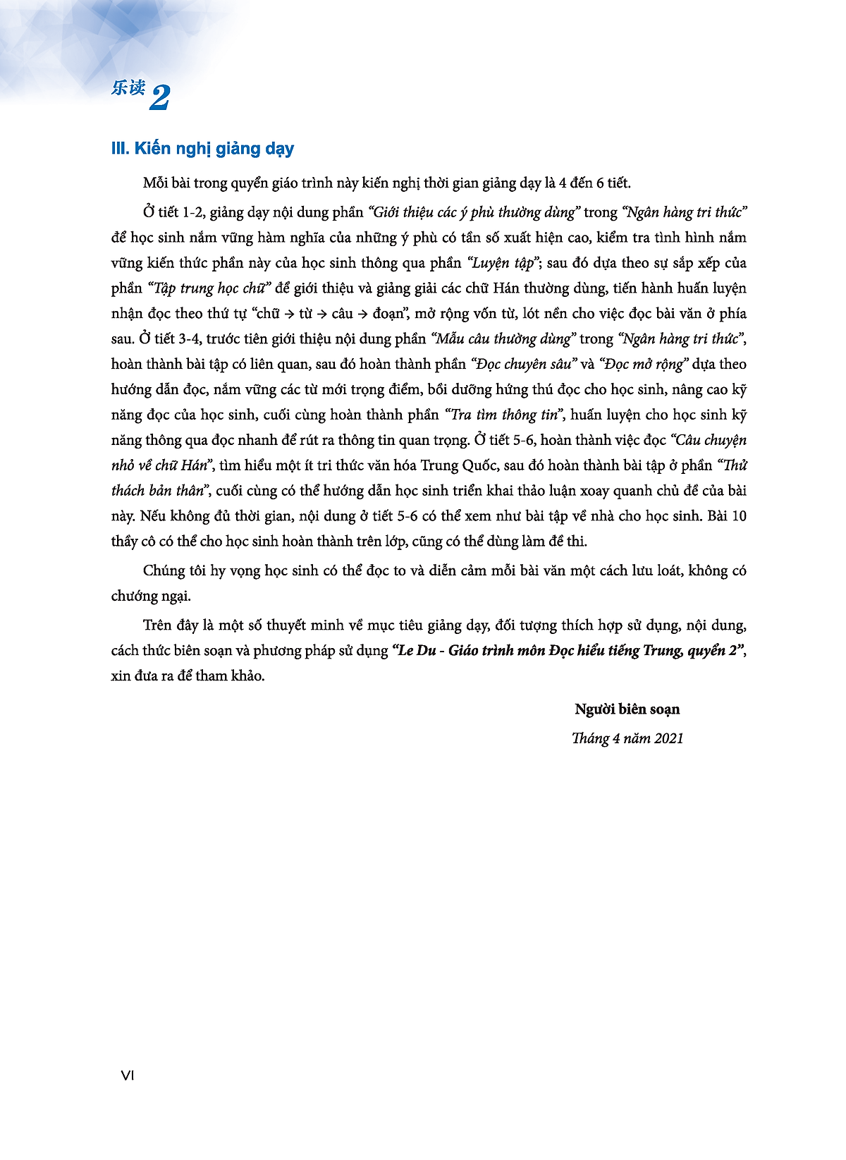 - Thử thách bản thân Mảng này là phần bài tập được thiết kế nhằm vào nội dung bài học. Việc thiết kế bài tập dựa theo nguyên tắc từ dễ đến khó, từ nội dung trong bài mở rộng đến ngoại khóa, từ chữ, từ (hoặc cụm từ), câu lại đến đoạn văn, từng bước dẫn dắt học sinh nắm vững nội dung bài học, đồng thời có thể dần dần hoàn thành bài tập một cách độc lập. Phần “Tập viết chữ Hán” chủ yếu để học sinh hoàn thành nhiệm vụ viết chữ trong ô vuông trên cơ sở nhận đọc chữ Hán và hiểu được nghĩa chữ, làm sâu sắc hơn sự lý giải và nắm vững về quy tắc kết cấu chữ Hán của học sinh. Nhằm vào những từ mới trọng điểm của mỗi bài, chúng tôi đã thiết kế bài tập “Chọn từ điền trống”. Mục đích chủ yếu của bài tập “Chọn câu trả lời thích hợp” là giúp người học nhận đọc câu trong ngữ cảnh. Phần “Câu đố” có độ khó nhất định, chủ yếu là để kiểm tra xem học sinh có am hiểu về cấu tạo, cách viết và các kiến thức có liên quan đến chữ Hán hay không, đáp án câu đố đều đến từ những chữ trọng điểm và những từ thường dùng xuất hiện trong bài đó. Theo sự gia tăng của lượng chữ mà người học phải học, bắt đầu từ bài 6, chúng tôi dùng những câu đơn giản cùng với từ mới xuất hiện trong bài đó để viết lại những mẩu truyện cười, mục đích là tái hiện và củng cố lại những nội dung đã học trong bài, bồi dưỡng hứng thú đọc cho học sinh. Để tiện cho học sinh lý giải nội dung giáo trình, tăng thêm sự thú vị, mỗi bài đều có kèm các hình minh họa phong phú. Kiến nghị giảng dạy Mỗi bài trong quyển giáo trình này kiến nghị thời gian giảng dạy là 2 đến 4 tiết. Cả bài 1 và bài 2 kiến nghị nên hoàn thành trong 4 tiết. Từ bài 3 đến bài 9, kiến nghị mỗi bài nên hoàn thành trong 3-4 tiết. Ở tiết thứ nhất, kết hợp với chữ ví dụ để giảng dạy nội dung của phần “Ngân hàng tri thức”, sau đó thông qua phần “Luyện tập” để kiểm tra mức độ nắm bắt kiến thức cơ bản của học sinh; từ tiết thứ 2 đến tiết thứ 4, dựa theo sự sắp xếp của phần “Tập trung học chữ” để giới thiệu và giảng giải các chữ Hán thường dùng, sau đó tiến hành huấn luyện nhận đọc theo thứ tự chữ → từ → câu → đoạn, mở rộng vốn từ, bồi dưỡng hứng thú đọc và kỹ năng đọc, cuối cùng hoàn thành bài tập ở phần “Thử thách bản thân”. Mục đích môn đọc hiểu không phải là viết, nhưng đối với những học sinh mới bắt đầu tiếp xúc với tiếng Trung thì việc vừa viết vừa nhận mặt chữ có thể giúp học sinh ghi nhớ chữ Hán hiệu quả hơn, thầy cô có thể tùy theo tình hình của học sinh mà xem xét việc cho thêm phần viết các chữ Hán cơ bản. Phần “Kiểm tra tổng kết” thầy cô có thể cho học sinh hoàn thành trên lớp, cũng có thể dùng làm đề kiểm tra giai đoạn, có thể hoàn thành trong 2 tiết. Các chữ trọng điểm, từ, câu ví dụ xuất hiện trong giáo trình với số lượng vừa phải, thầy cô có thể tùy theo tình hình của học sinh để chọn dùng một cách linh hoạt. Nếu học sinh có trình độ khá cao, thầy cô có thể cân nhắc bổ sung thêm chữ ví dụ, từ ví dụ, câu ví dụ; nếu học sinh có trình độ hơi thấp, thầy cô có thể chỉ giảng nội dung của phần “Học để nhớ”, bỏ qua nội dung phần “Học để đọc”, cũng có thể xem xét tăng thêm thời lượng học. Trên đây là một số thuyết minh về mục tiêu giảng dạy, đối tượng thích hợp sử dụng, nội dung thể lệ và phương pháp sử dụng “Le Du - Giáo trình môn Đọc hiểu tiếng Trung, quyển 2”, xin đưa ra để tham khảo.