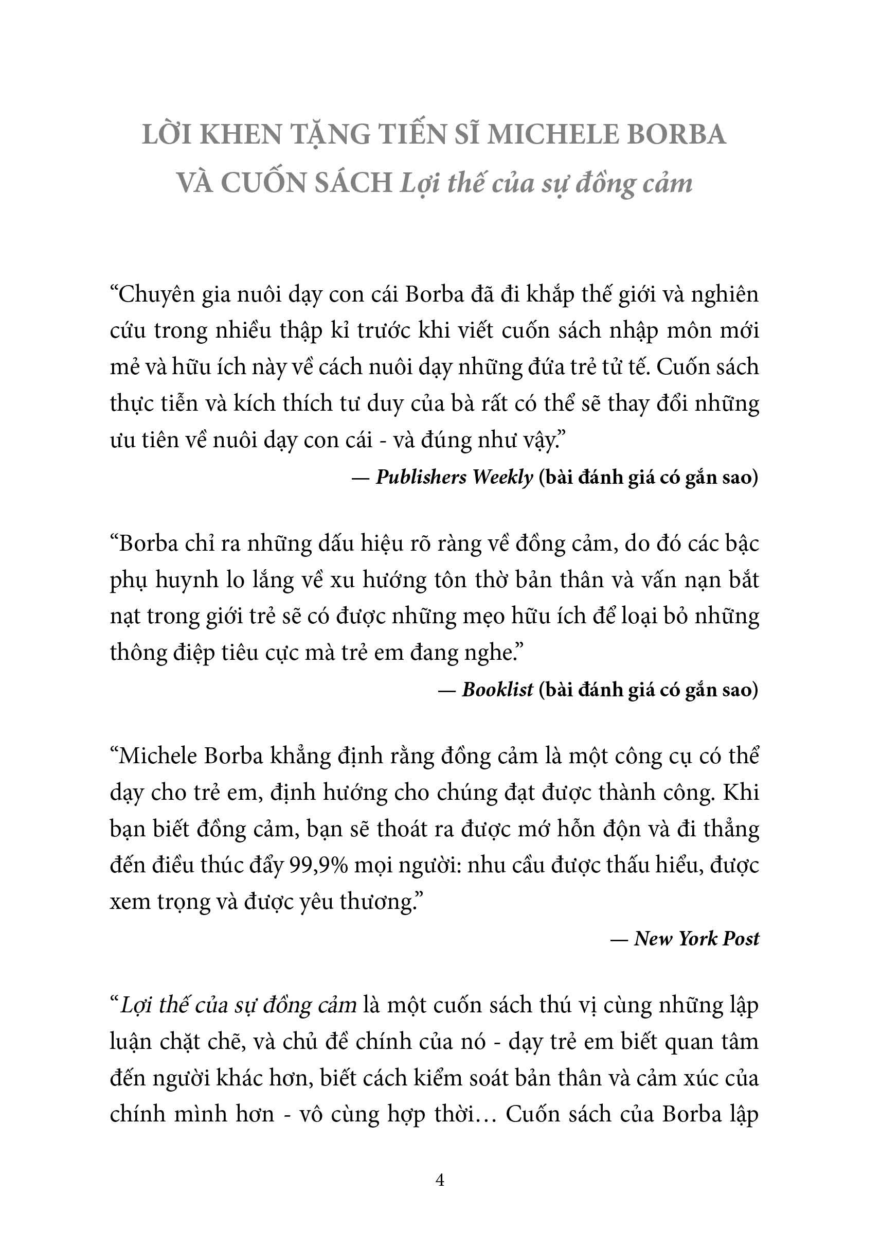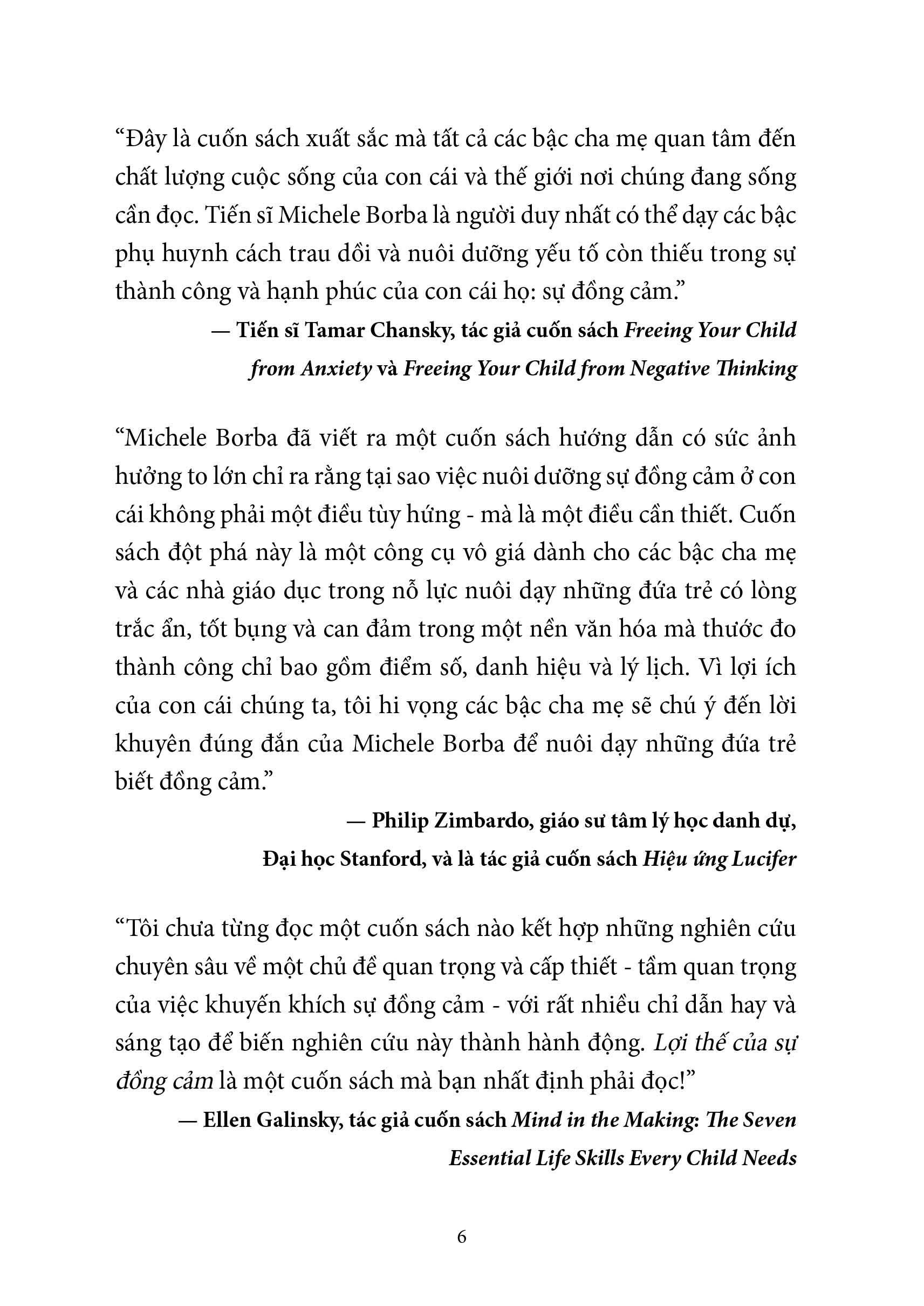 Trong cuốn sách Lợi thế của sự đồng cảm, Tiến sĩ Giáo dục Borba – tác giả sách bán chạy kiêm chuyên gia về nuôi dạy con – đã chỉ ra các động lực gây nên cuộc khủng hoảng sự đồng cảm và xác nhận được: sự đồng cảm có thể được nuôi dưỡng, việc nuôi dưỡng dự đồng cảm sẽ thay đổi cuộc sống của con cái chúng ta, cũng như tương lai của nhân loại.