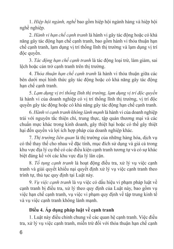 Mua tại TiktokTác Giả: Nhiều Tác Giả Nhà cung cấp ndbooks Nhà Xuất Bản: Nhà Xuất Bản Lao Động Năm Xuất Bản: 2025 Kích Thước: 14.5 x 20.5 cm Loại Bìa: Bìa Mềm Số Trang: 76 Trọng Lượng: 300g QUỐC HỘI Luật số: 23/2018/QH14 CỘNG HOÀ XÃ HỘI CHỦ NGHĨA VIỆT NAM Độc lập – Tự do - Hạnh phúc LUẬT CẠNH TRANH Căn cứ Hiến pháp nước Cộng hòa xã hội chủ nghĩa Việt Nam; Quốc hội ban hành Luật Cạnh tranh. Chương I NHỮNG QUY ĐỊNH CHUNG Điều 1. Phạm vi điều chỉnh Luật này quy định về hành vi hạn chế cạnh tranh, tập trung kinh tế gây tác động hoặc có khả năng gây tác động hạn chế cạnh tranh đến thị trường Việt Nam; hành vi cạnh tranh không lành mạnh; tố tụng cạnh tranh; xử lý vi phạm pháp luật về cạnh tranh; quản lý nhà nước về cạnh tranh. Điều 2. Đối tượng áp dụng