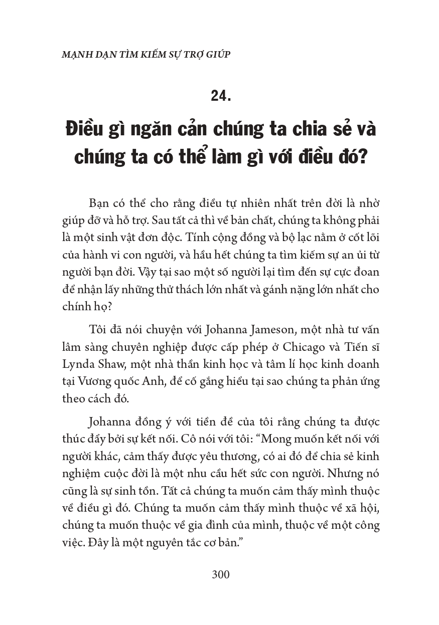 "Có quá nhiều thứ ngăn cản chúng ta nhờ trợ giúp. Điều mà chúng ta luôn không nhận ra là mọi người đều muốn giúp đỡ, họ thích giúp đỡ và họ sẽ cảm thấy tổ thương nếu chúng ta không để họ giúp đỡ mình."