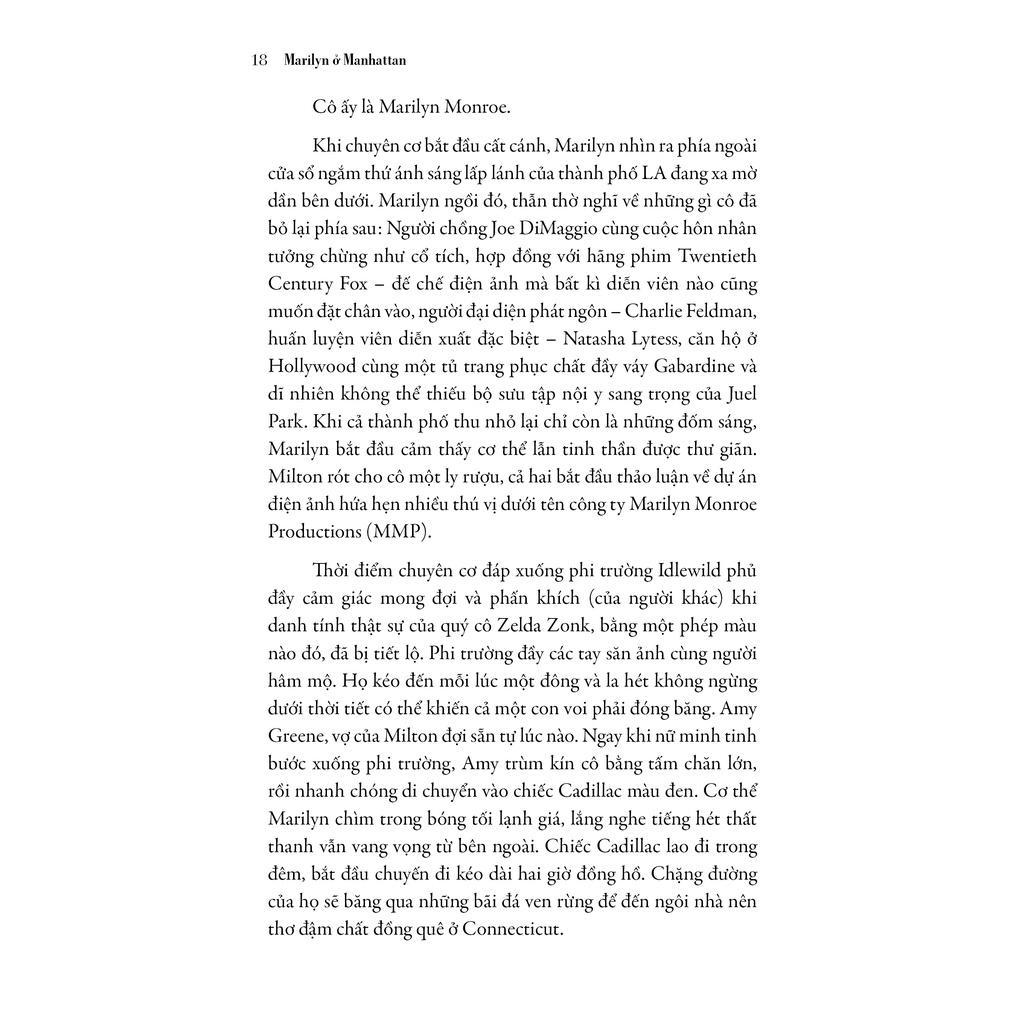 Nhắc đến Marilyn Monroe, người ta dễ dàng liên tưởng ngay đến một “quả bom sex”, một quý cô dám thách thức chính trường chính trị, một cái chết chấn động thế giới và những lùm xùm đời tư mà người đời thêu dệt. Tất cả yếu tố ngoại cảnh đó gần như làm lu mờ những gì Marilyn cống hiến cho nghệ thuật. Marilyn ở Manhattan: Một Năm Hạnh Phúc là quyển sách hiếm hoi, đưa cái nhìn trực diện về một Marilyn Monroe tài năng diễn xuất, thông minh, thích đọc sách, bậc thầy trang điểm... đến người đọc. Từ đó, khai thác nhiều bí mật thú vị xoay quanh cuộc sống nữ minh tóc vàng.
