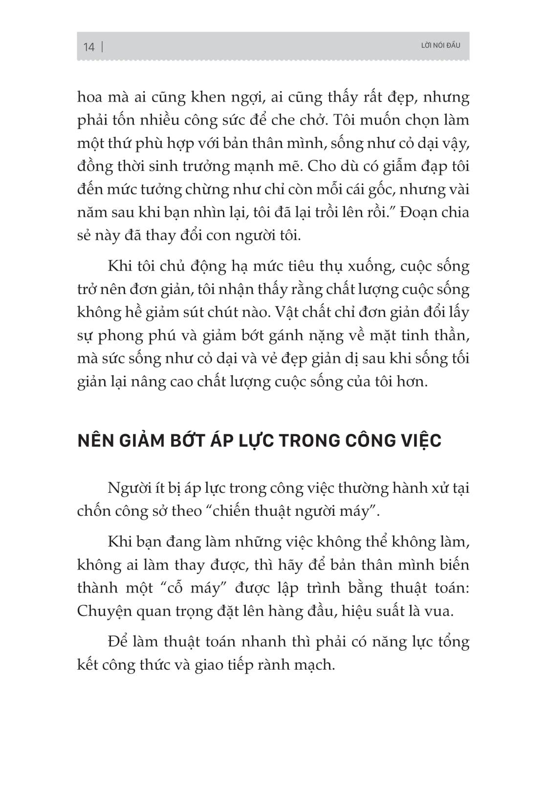 Nếu bạn không có đủ củi để nấu sôi một ấm nước đầy thì hãy bỏ bớt nước đi, đừng cố gắng chạy đi kiếm củi nữa. Nếu cuộc sống đôi khi quá mệt mỏi, không đủ nghị lực để tiếp tục, thì bớt lại sự tham cầu ước vọng sẽ thấy tâm m.ình nhẹ nhõm hơn. Đừng vội vã, hãy ăn ngon uống kỹ, tôn trọng niềm vui ban sơ của m.ình, nên chơi, nên vui, để cuộc sống được cân bằng giữa làm việc và nghỉ ngơi.