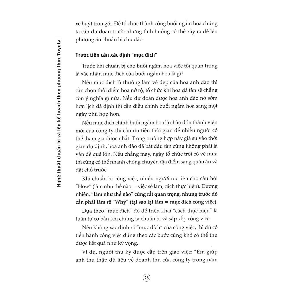Nội dung chính của cuốn sách Nghệ thuật chuẩn bị và lên kế hoạch theo phương thức Toyota được chọn lọc từ những câu nói, câu chuyện thực tế của những người từng là quản lý, công xưởng trưởng làm việc tại Toyota từ những năm 1960 cho đến năm 2015. Hiện nay, họ là các chuyên gia đào tạo “nâng cao năng suất, chất lượng” tại công ty cổ phần OJT Solutions (trụ sở tại thành phố Nagoya, tỉnh Aichi). Cuốn sách đúc kết kinh nghiệm, phương pháp có thể áp dụng được cho bất kỳ ai đang làm việc ở bất kỳ ngành nghề, lĩnh vực nào.