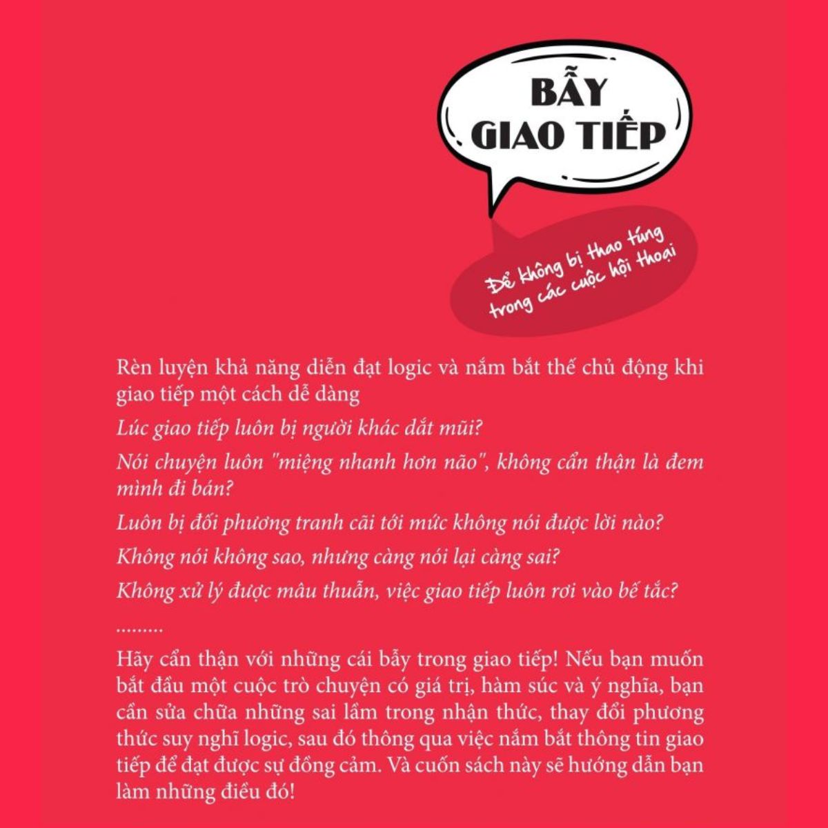 Cuốn sách “Bẫy giao tiếp – Để không bị thao túng trong các cuộc hội thoại” là cẩm nang giúp bạn vượt qua những cạm bẫy giao tiếp phổ biến, từ đó cải thiện khả năng trò chuyện và xây dựng mối quan hệ vững chắc. Qua 9 chương sách, tác giả hướng dẫn cách tránh những lỗi giao tiếp thường gặp, sửa chữa những nhận thức sai lầm, và nâng cao chất lượng giao tiếp bằng cách khai thác các chủ đề có giá trị và đồng cảm với người đối diện.