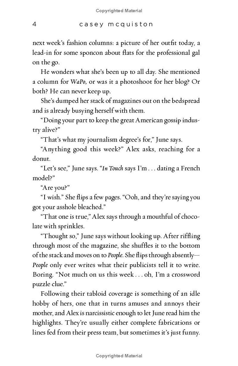 - Instant New York Times and USA Today bestseller * What happens when America's First Son falls in love with the Prince of Wales? Alex Claremont-Diaz is handsome, charismatic, a genius – pure millennial-marketing gold for the White House ever since his mother first became President of the United States. There’s only one problem. When the tabloids get hold of a photo involving an altercation between Alex and Prince Henry, U.S./British relations take a turn for the worse. Heads of family and state devise a plan for damage control: stage a truce. But what begins as a fake, rammable friendship grows deeper, and more dangerous, than either Alex or Henry could have imagined. Soon they are hurtling into a secret romance that could derail the presidential campaign and upend two nations. 'Red, White & Royal Blue is outrageously fun. It is romantic, sexy, witty, and thrilling. I loved every second.' - Taylor Jenkins Reid, New York Times bestselling author of Daisy Jones & The Six