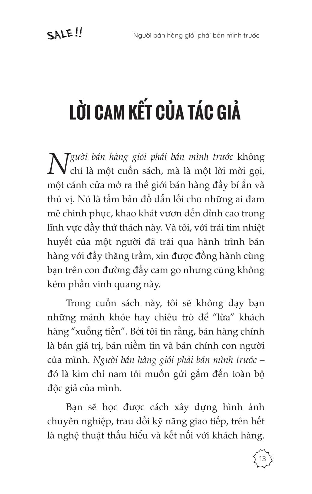 "Người bán hàng giỏi phải "bán m.ình" trước" không chỉ là một cuốn sách hướng dẫn kỹ năng bán hàng, mà còn là người bạn đồng hành tin cậy trên con đường chinh phục thành công trong lĩnh vực này. Với những chia sẻ thực tiễn, những bài học kinh nghiệm quý báu, và những chiến lược hiệu quả, cuốn sách sẽ giúp bạn vượt qua mọi khó khăn và thách thức, biến những ước mơ của bạn thành hiện thực. Hãy bắt đầu hành trình "bán m.ình" ngay hôm nay và trở thành người bán hàng xuất sắc!