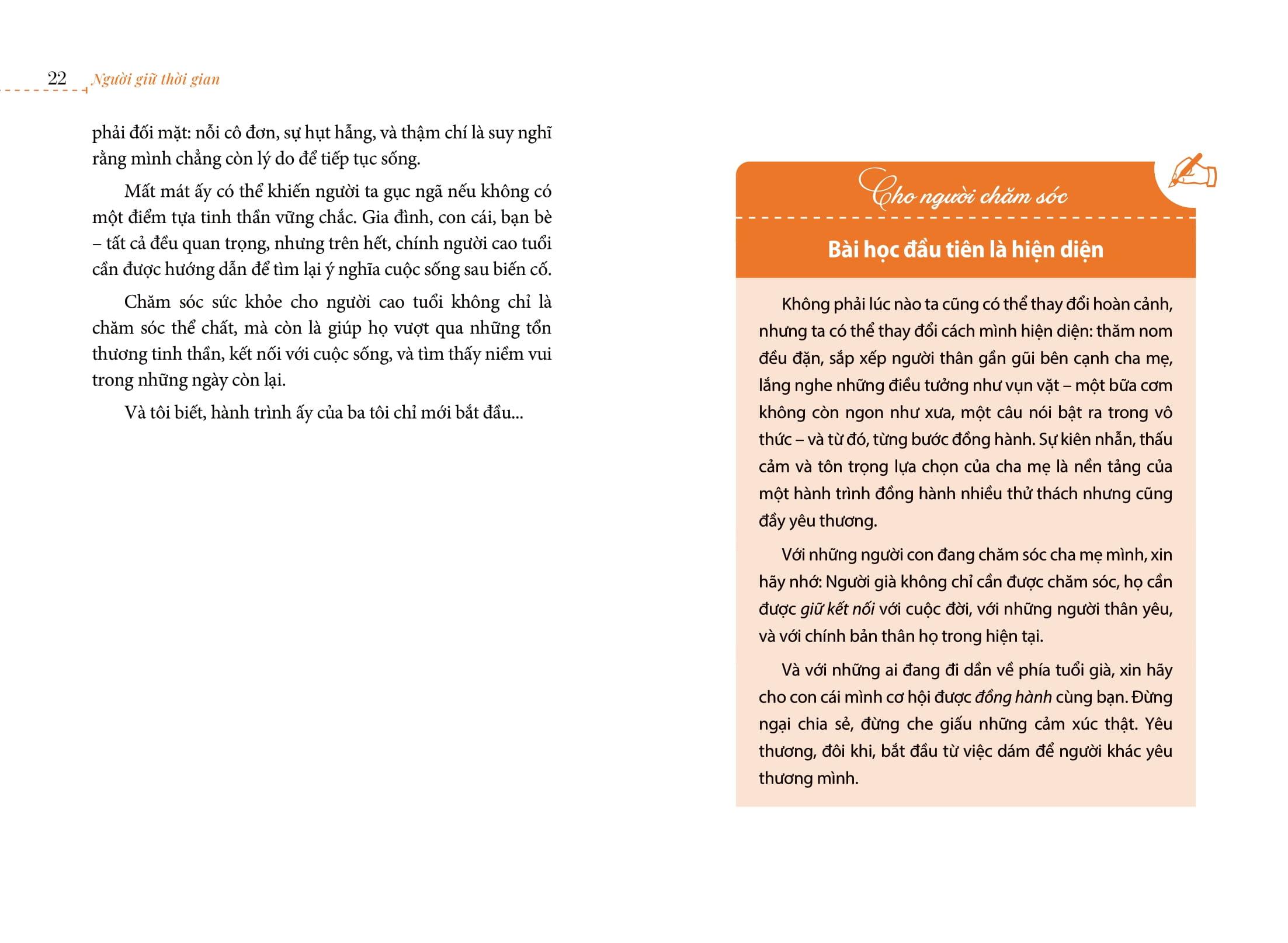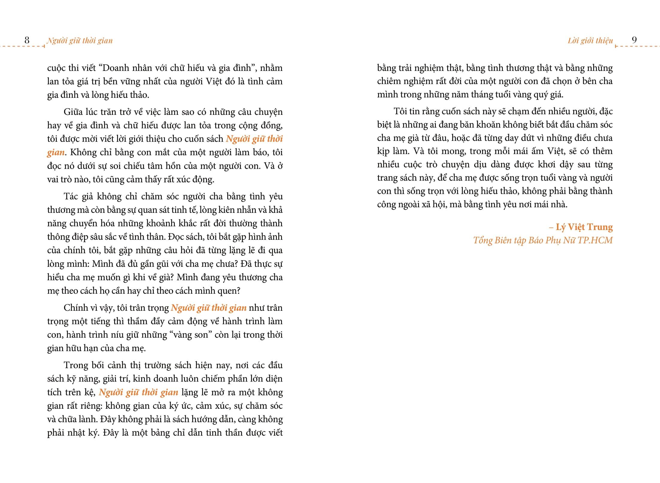 “Người giữ thời gian là cuốn sách của tình yêu thương và lòng hiếu kính. Tôi tin rằng qua từng trang viết chân thật và xúc động này, bạn – người đang miệt mài chăm sóc cha mẹ – sẽ tìm thấy sự đồng cảm sâu sắc, những lời khuyên hữu ích và cả nguồn động viên tinh thần quý giá. Với tất cả tấm lòng của một người con và một chuyên gia tâm lý đã đồng hành cùng nhiều gia đình, tôi trân trọng giới thiệu cuốn sách đến bạn. Hy vọng rằng Người giữ thời gian sẽ truyền cảm hứng để bạn giữ lấy thời gian, giữ lấy người thân yêu và giữ lấy tình yêu trong gia đình m.ình – hôm nay và mãi mãi.”