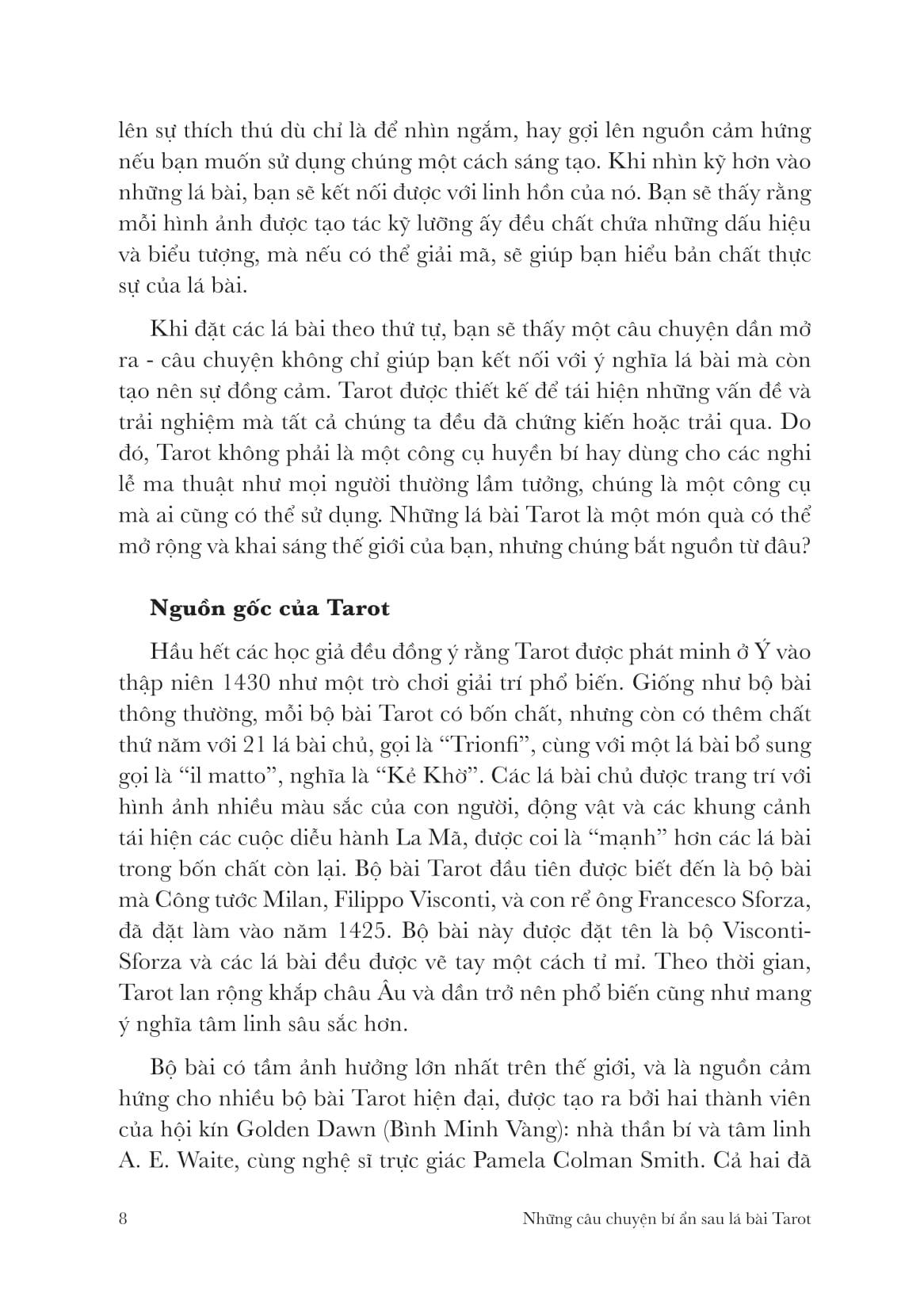 Tarot không đơn giản chỉ là những lá bài đầy màu sắc; đó là một vũ trụ huyền bí, mê hoặc và ẩn chứa nhiều thông điệp sâu sắc. Mỗi lá bài đều có một câu chuyện riêng, những biểu tượng tâm linh kết hợp với nhau một cách tài tình, trở thành một công cụ tuyệt vời để bạn khám phá câu chuyện của một ai đó hoặc của chính m.ình. Những câu chuyện bí ẩn sau lá bài Tarot của tác giả - chuyên gia kể chuyện Alison Davies sẽ dẫn dắt bạn bước vào hành trình Tarot màu nhiệm ấy, hướng dẫn bạn kết nối với các hình ảnh của từng lá bài trong bộ bài Rider-Waite Smith, để hiểu sâu – nắm chắc – cảm nhận được trọn vẹn nhất một bộ bài Tarot.