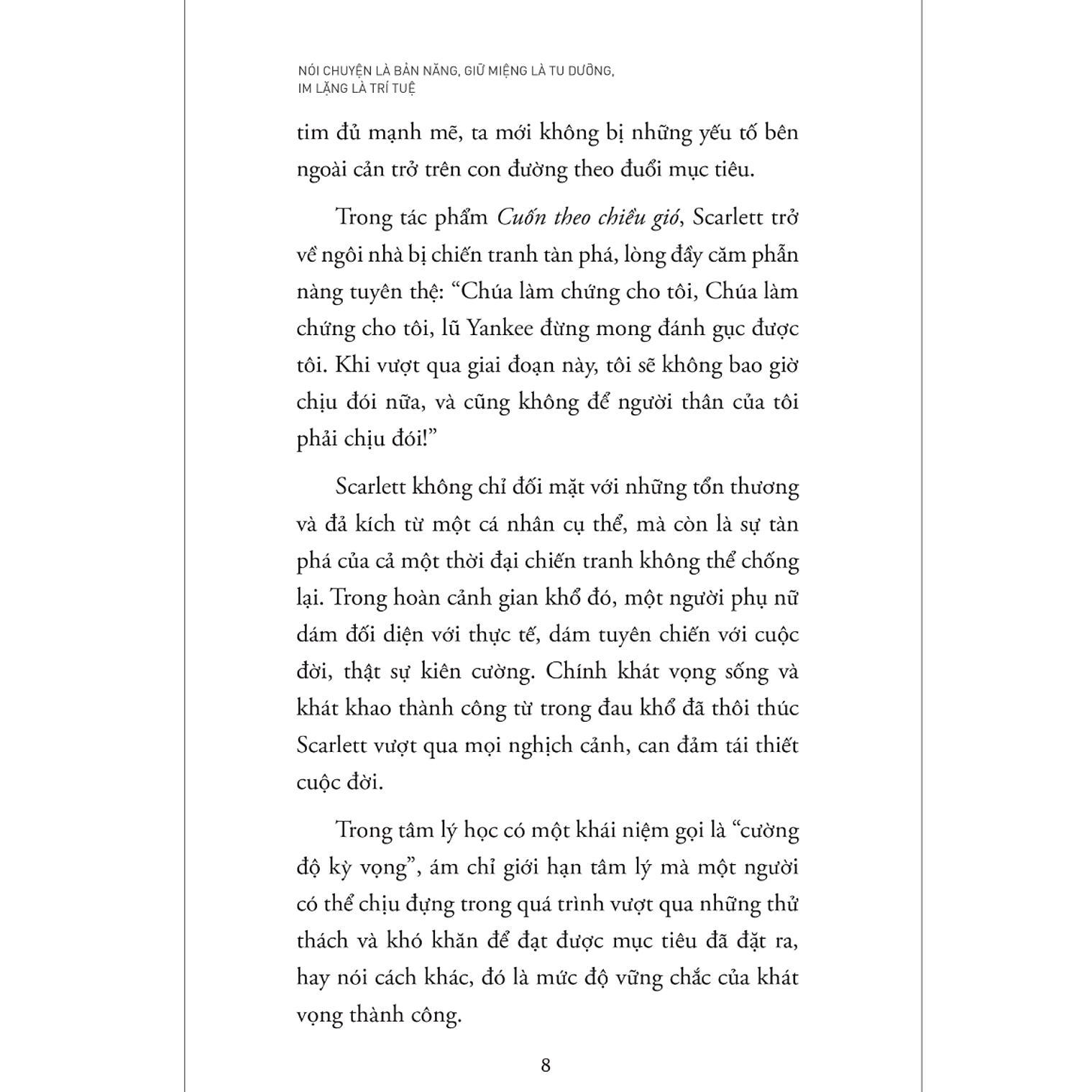 "Nói chuyện là bản năng, giữ miệng là tu dưỡng, im lặng là trí tuệ" không chỉ giúp bạn giao tiếp tốt hơn, mà còn hướng tới một phiên bản trưởng thành và lành mạnh hơn của chính mình – một người biết thấu hiểu, biết yêu thương và đủ mạnh mẽ để không làm tổn thương cũng như không để bị tổn thương.