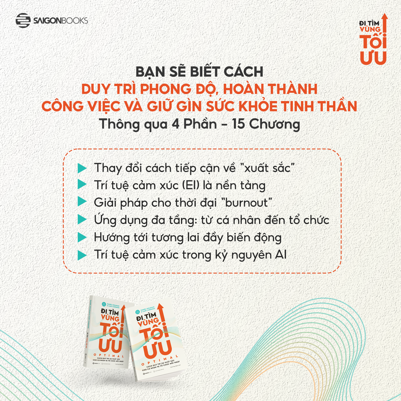 Trong thời đại nhiều biến động, khi áp lực công việc rất dễ dẫn đến kiệt sức, quyển sách Đi Tìm Vùng Tối Ưu đã chỉ ra con đường bền vững hơn: vận dụng trí tuệ cảm xúc (Emotional Intelligence – EI) để xây dựng sự tập trung, nuôi dưỡng năng lượng và gắn kết cảm xúc. Là tác phẩm từ hai chuyên gia tâm lý nổi tiếng thế giới là Daniel Goleman và Cary Cherniss, Đi Tìm Vùng Tối ưu đã nhanh chóng được cộng đồng lãnh đạo & chuyên gia hàng đầu thế giới đánh giá cao ngay khi vừa ra mắt.