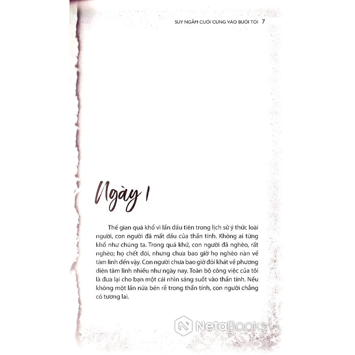 Chìm vào giấc ngủ trước màn hình tivi hay máy vi tính như nhiều người đang làm ngày nay không phải là cách thoải mái để kết thúc một ngày dài bận rộn. Những gì chúng ta làm vào buổi tối có thể ảnh hưởng xấu và làm rối loạn giấc ngủ, cũng như giấc mơ của ta. Suy ngẫm cuối cùng vào buổi tối đề cập đến nhiều chủ đề khác nhau, được tuyển chọn đặc biệt để đọc vào buổi tối. Cuốn sách sẽ cho bạn một lựa chọn khác để kết thúc một ngày với một chút hương vị thiền để vượt qua đêm dài.