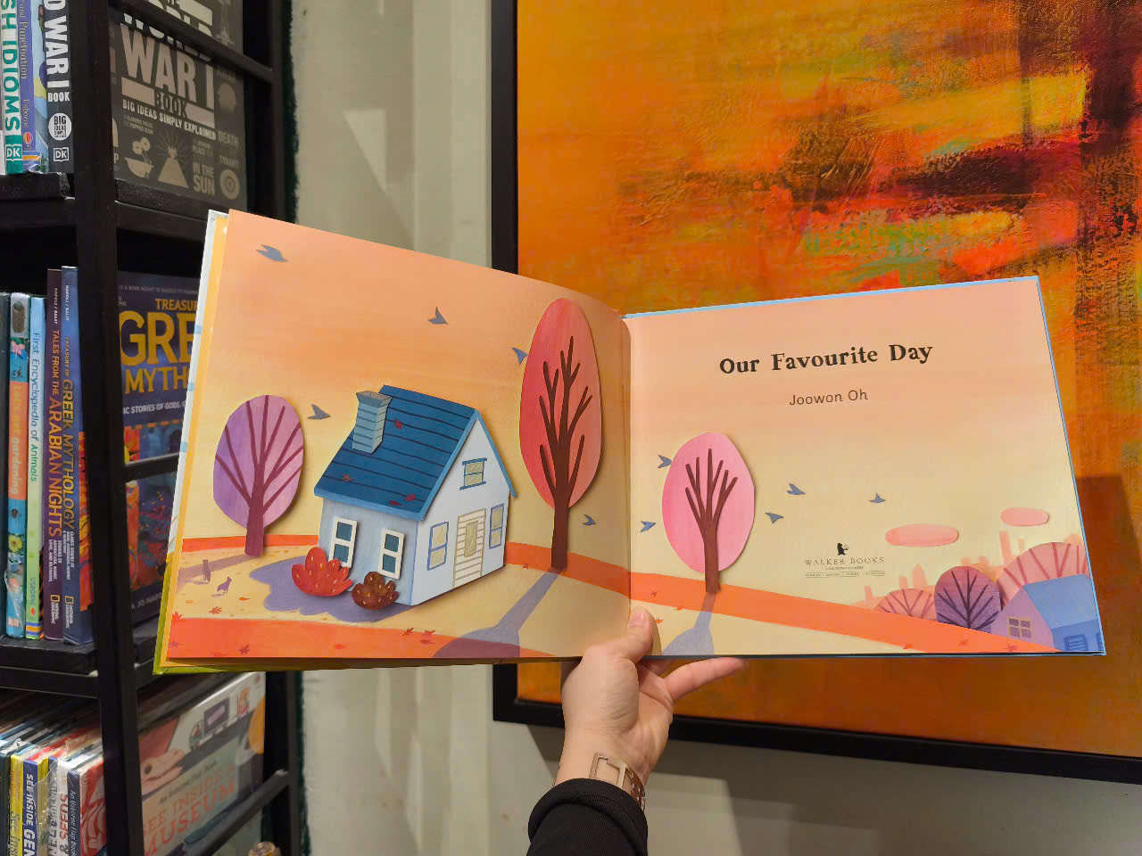 Every morning Grandpa follows his normal routine. He drinks his tea, waters his plants, tidies up, and takes the bus into town. Grandpa enjoys his daily tasks, but there’s one day each week that is extra special. That’s the day he might visit the craft shop, get two orders of dumplings to go, and possibly pick some flowers he sees along the path. With its spare text and wonderfully warm watercolor and cut-paper illustrations just begging to be pored over, Joowon Oh’s tale of the singular love between a grandfather and granddaughter will nestle within the heart of every reader.