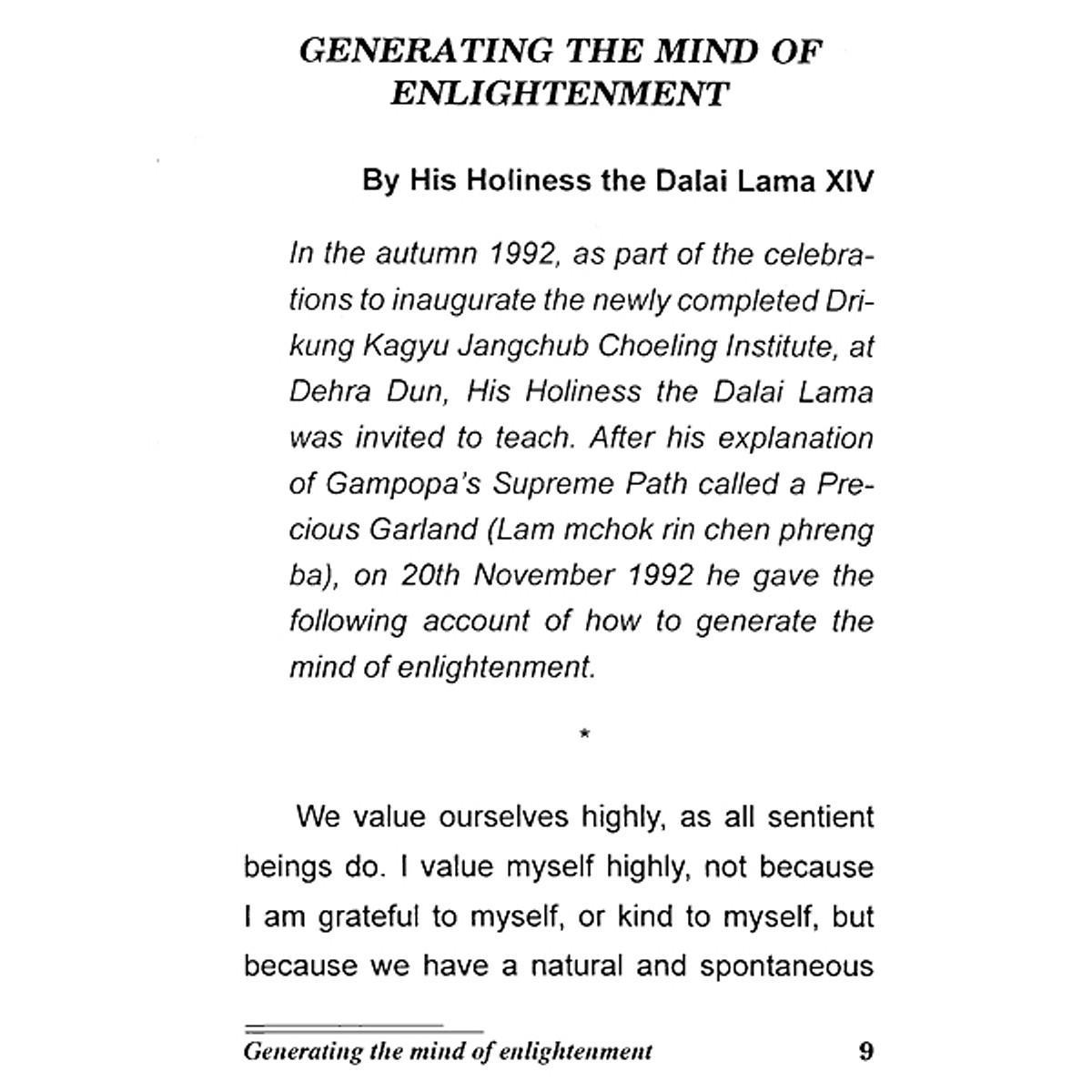 Tập sách này gồm 2 bài giảng của Đức Đạt-lai Lạt-ma XIV, được ngài Rajiv Mehrotra - đệ tử của đức Đạt-lai Lạt-ma - trực tiếp ban cho chúng tôi cùng với 4 bài giảng khác nữa, kèm theo một văn bản cho phép chuyển dịch tất cả sang Việt ngữ và phát hành ở dạng song ngữ Anh-Việt. Phát tâm Bồ-đề là bài giảng được chúng tôi hoàn tất trước tiên và được chọn làm tựa đề cho tập sách này vì tính phổ quát của nó đổi với mọi người Phật tử. Bài giảng này có nội dung khuyến khích và hướng dẫn việc phát tâm Bồ-đề, một yêu cầu tối thiết yếu đối với bất cứ ai muốn bước chân vào con đường tu tập theo Phật giáo Đại thừa.