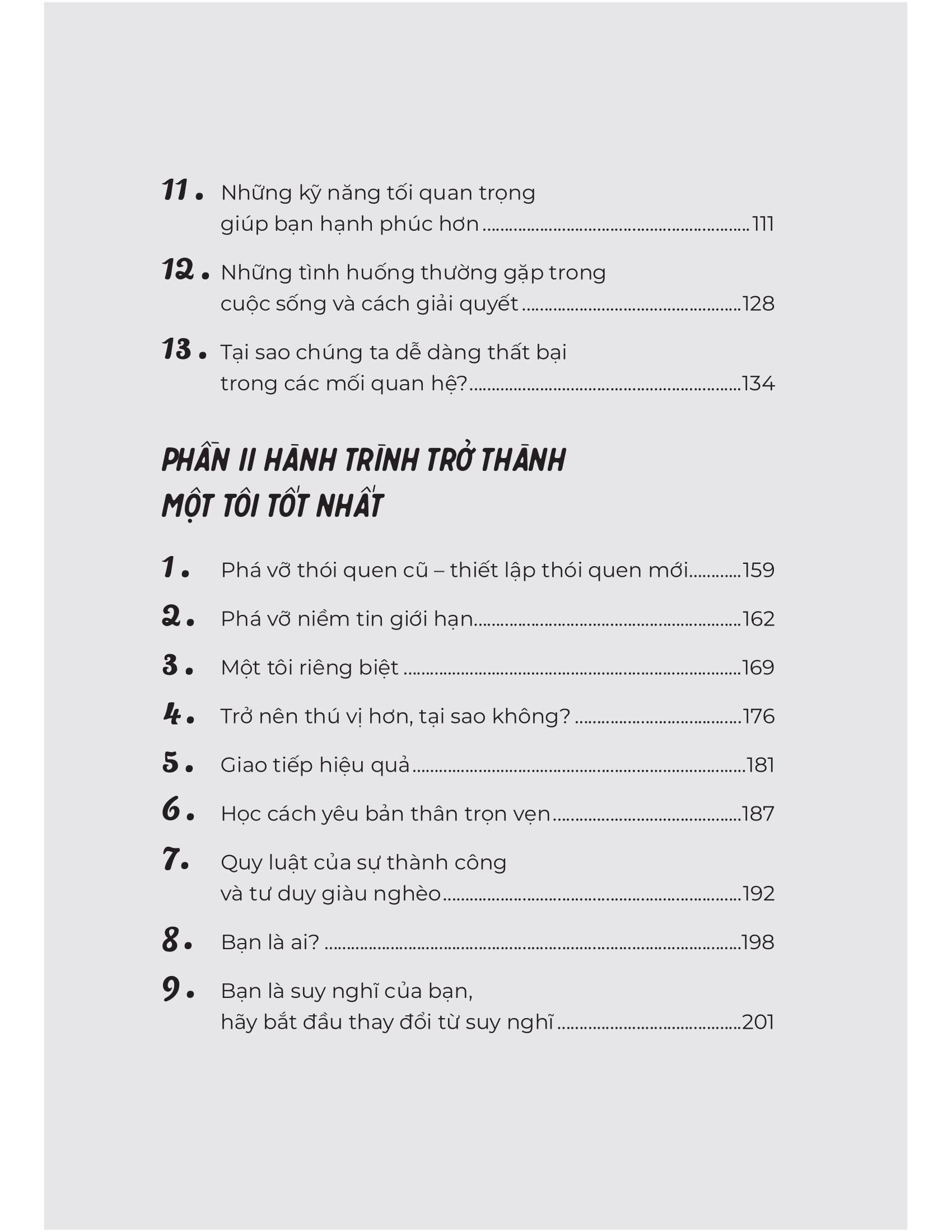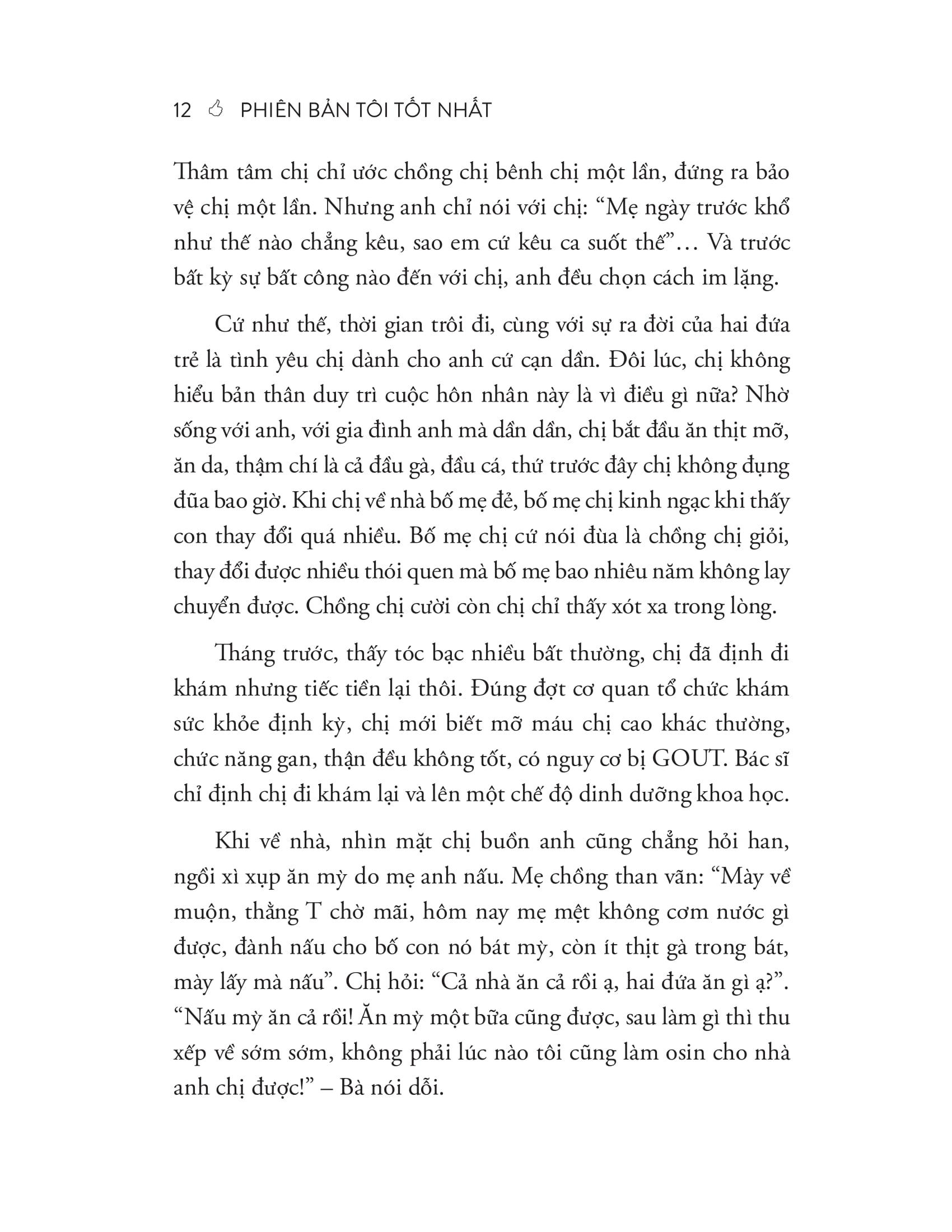 - Nếu bạn là nam giới, khi cầm trên tay cuốn sách này, bạn cũng sẽ tìm được điều gì đó thú vị, thay đổi góc nhìn của bạn, phá vỡ những định kiến quen thuộc. TÓM TẮT SÁCH Phiên bản tôi tốt nhất, được tinh chỉnh từ cuốn Lợi thế đàn bà, đổi mới và bổ sung rất nhiều nội dung giá trị, dù vẫn bám vào những câu chuyện, bài học xoay quanh người phụ nữ, nhưng nó không hẳn chỉ dành riêng cho phụ nữ. Phiên bản tôi tốt nhất dành cho bất kỳ ai muốn tìm thấy chính m.ình, hiểu rằng m.ình là người duy nhất chịu trách nhiệm cho mọi thứ đến với m.ình trong đời, nỗ lực để hoàn thiện m.ình mỗi ngày. Như mọi cuốn sách khác của Giang Đinh, Phiên bản tôi tốt nhất hướng đến thay đổi tư duy. Bởi thay đổi tư duy, bao giờ cũng thế, chính là thay đổi cuộc đời! CUỐN SÁCH CÓ GÌ ĐẶC BIỆT