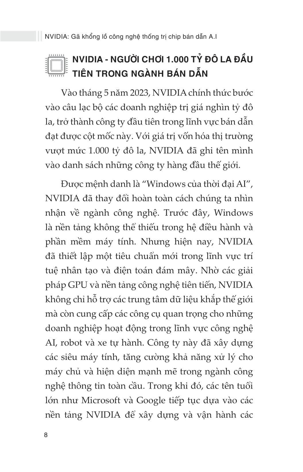 Trong cuốn sách Phong cách NVIDIA, tác giả Tae Kim sẽ dẫn chúng ta đi dọc qua lịch sử của công ty công nghệ hàng trăm tỷ USD này, từ quá trình trưởng thành của ba nhà đồng sáng lập, đến những cuộc họp đầu tiên trong quán ăn gia đình Denny's, rồi từng bước một vượt qua đủ những thành công và thất bại để trở thành một đế chế công nghệ như hiện tại. Từ đó, tác giả rút ra được những đặc điểm đã làm nên “Phong cách Nvidia”, chiếc kim chỉ nam dẫn lối Jensen Huang và Nvidia làm nên những điều phi thường và vĩ đại.