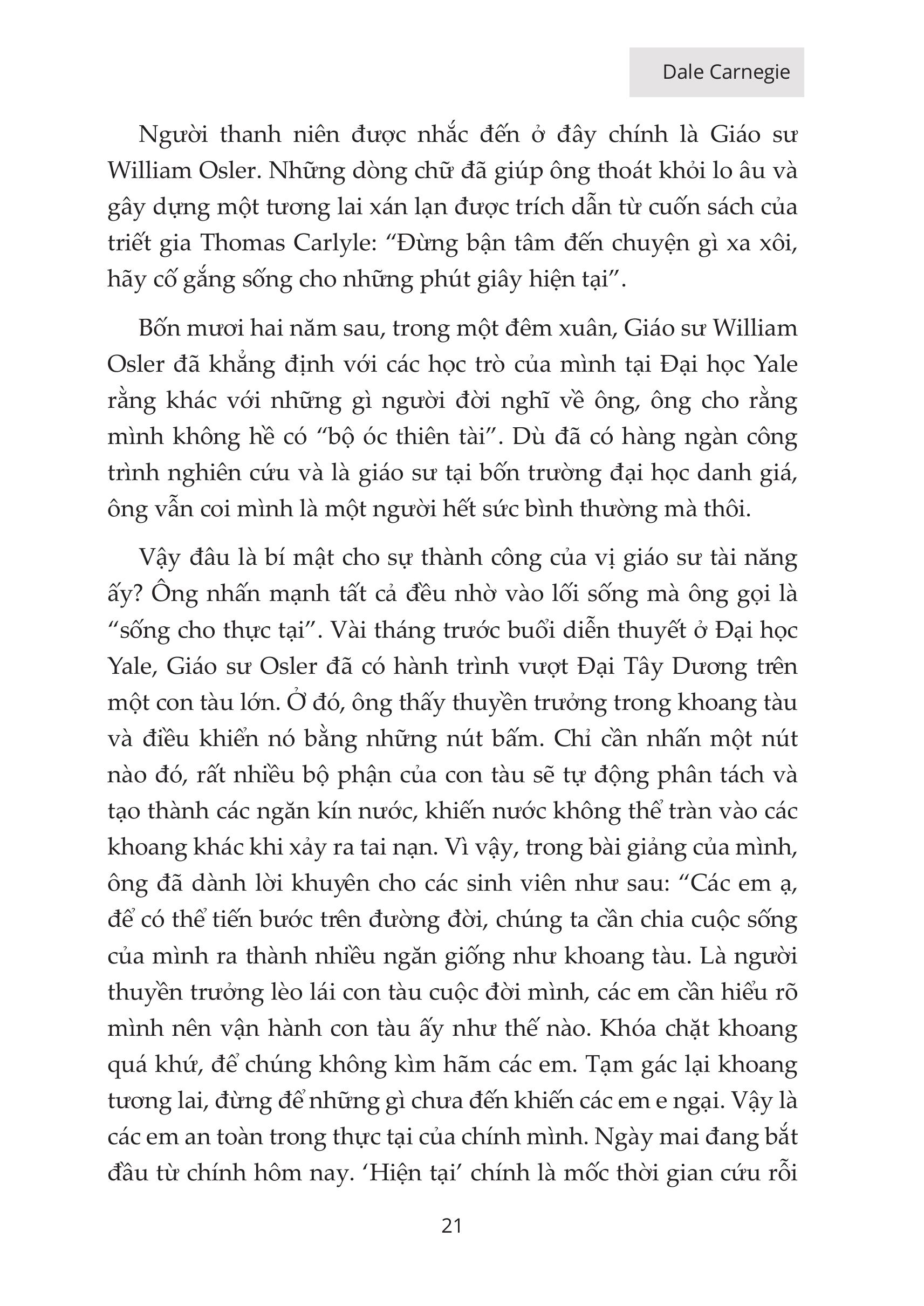 Bất kỳ ai đang sống đều sẽ có những lo lắng thường trực về học hành, công việc, những hoá đơn, chuyện nhà cửa,... Cuộc sống không dễ dàng giải thoát bạn khỏi căng thẳng, ngược lại, nếu quá lo lắng, bạn có thể mắc bệnh trầm cảm. Quẳng Gánh Lo Đi Và Vui Sống khuyên bạn hãy khóa chặt dĩ vãng và tương lai lại để sống trong cái phòng kín mít của ngày hôm nay. Mọi vấn đề đều có thể được giải quyết, chỉ cần bạn bình tĩnh và xác định đúng hành động cần làm vào đúng thời điểm.