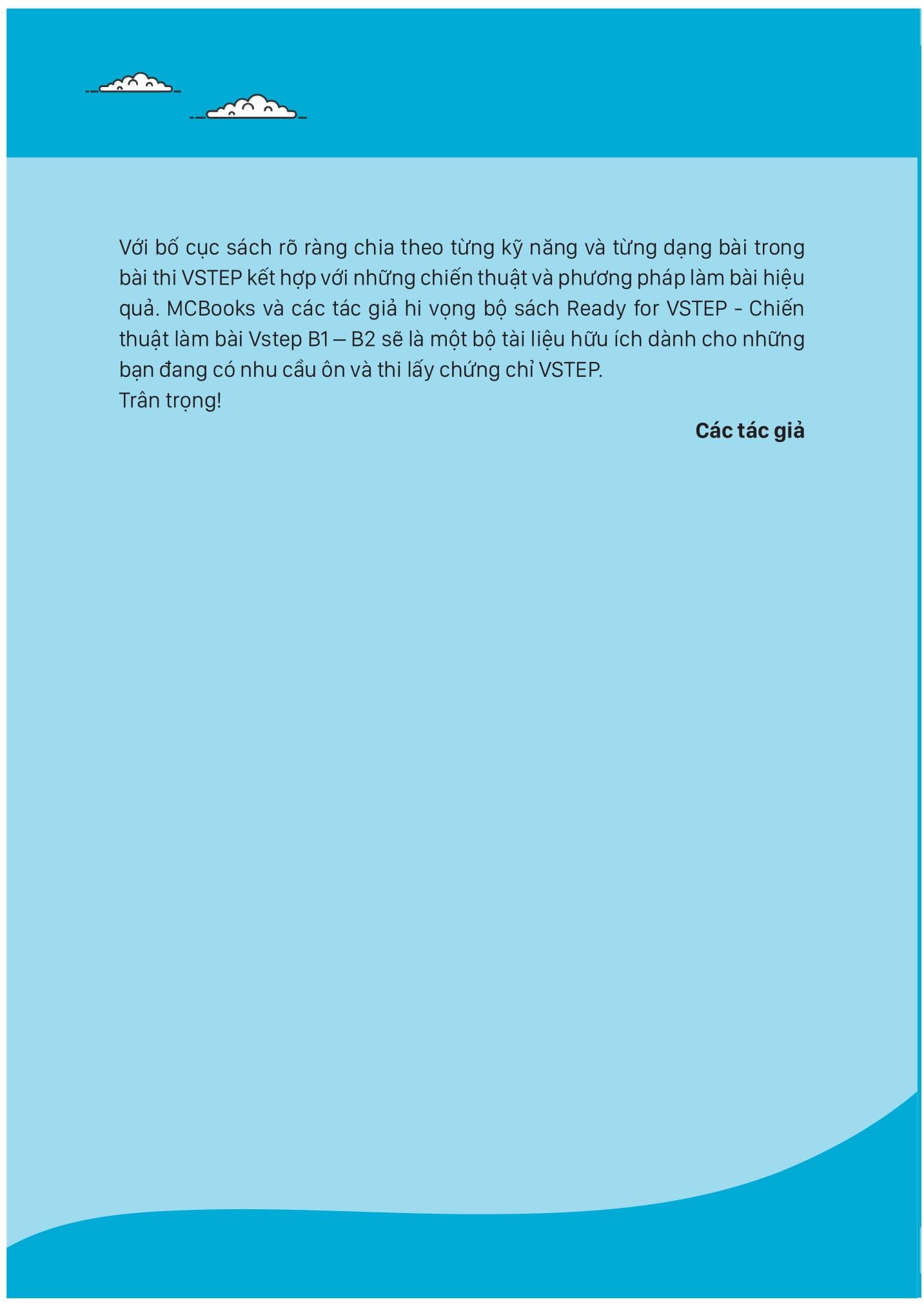 Hiểu được tầm quan trọng của chứng chỉ VSTEP với người Việt, MCBooks cùng đội ngũ Giảng viên tiếng Anh của Trường Đại học Ngoại Ngữ – Đại học Quốc gia Hà Nội đã biên soạn và xuất bản bộ sách “Ready for VSTEP – Chiến thuật làm bài VSTEP” gồm 2 cuốn B1 và B2