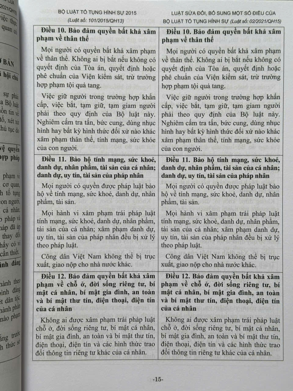 Cuốn sách sẽ giúp bạn đọc thuận tiện trong việc tra cứu, áp dụng Bộ luật Tố tụng hình sự khi so sánh 510 Điều của Bộ luật Tố tụng hình sự năm 2015 với Bộ luật Tố tụng hình sự năm 2015 đã được sửa đối, bổ sung năm 2021.